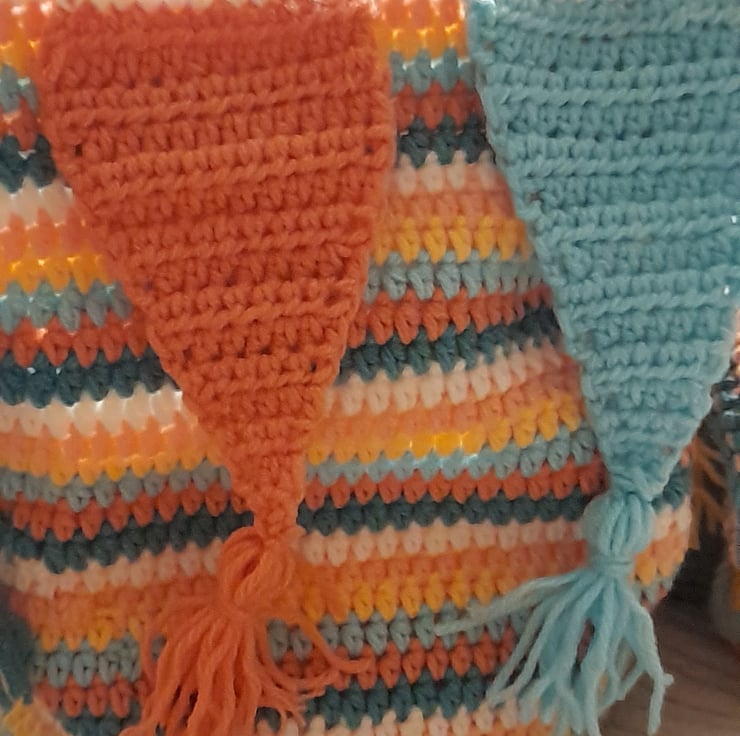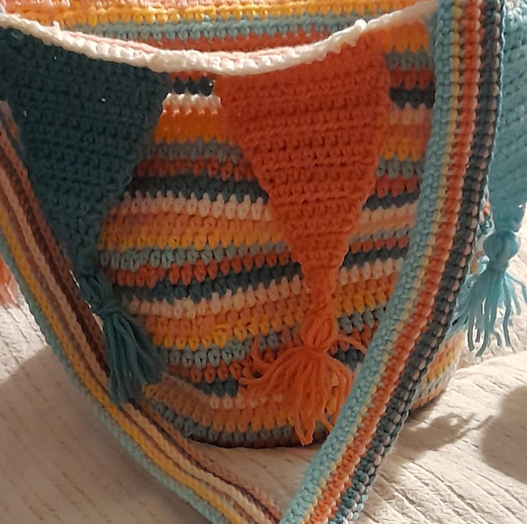 Designed by Lucy Cartwright this handmade crochet bag is perfect for those summer outfits, big enough to fit your essentials adding some fun to any outfit.. Can be worn over the shoulder or as a cross body.