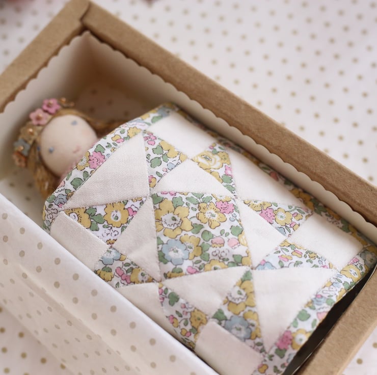 She measures approximately 15cm, and comes with a hand stitched liberty patchwork quilt. Her dress is removable and made from beautiful Liberty of London tana lawn in Camomile. Her tiny apron is embroidered with a little rose and running stitch. Her accessories include a tiny leather bag and a little flower crown. Each flower is made from leather and attached with a gold bead. Her shoes are painted with gold fabric paint and embroidered with metallic gold thread and adorned with a little gold flower. Her body is constructed from cotton and she has stripy legs. Her hair is made from Rowan yarn and she is filled with Habico toy stuffing.
