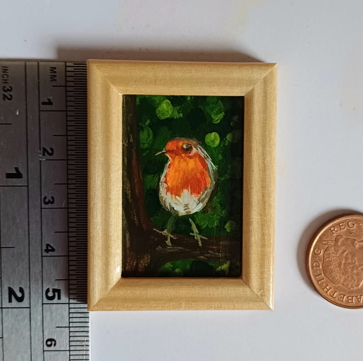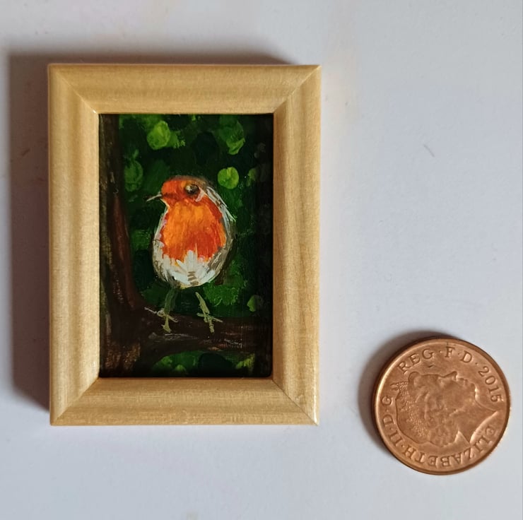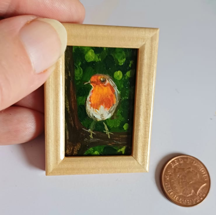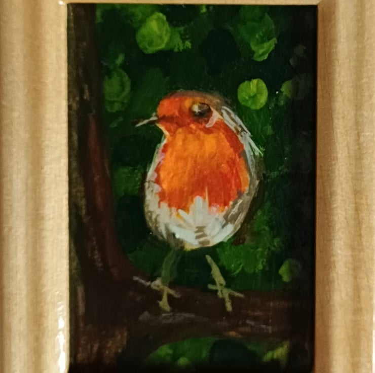 An original oil painting of a Robin. Painted by me using oil paints on my handmade art board and in a wooden frame.