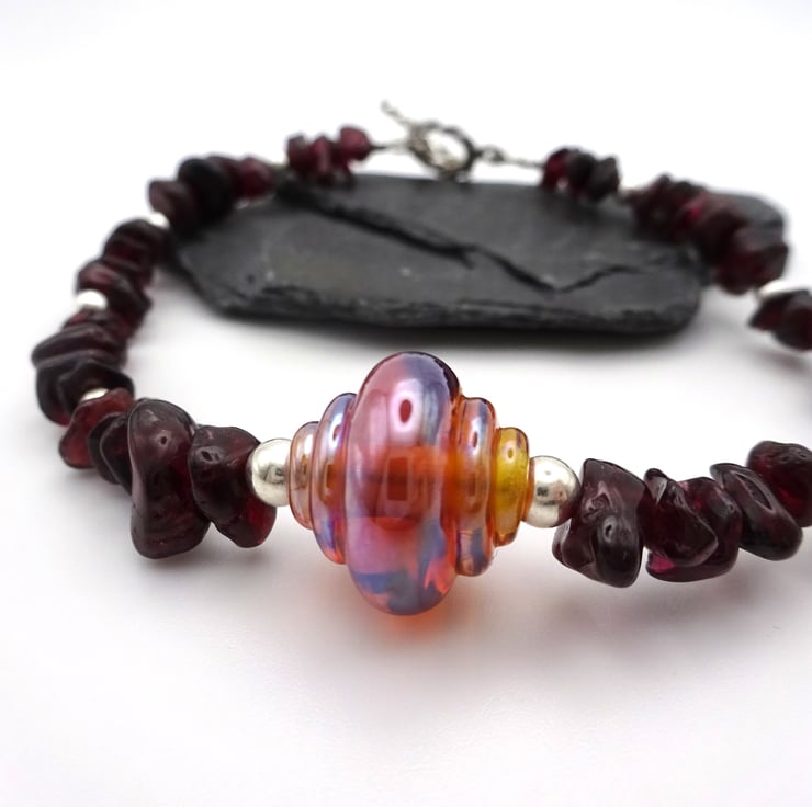 A bracelet made with garnet gemstone chips, sterling silver beads and a handmade lampwork glass focal bead. The bracelet fastens with a sterling silver toggle.