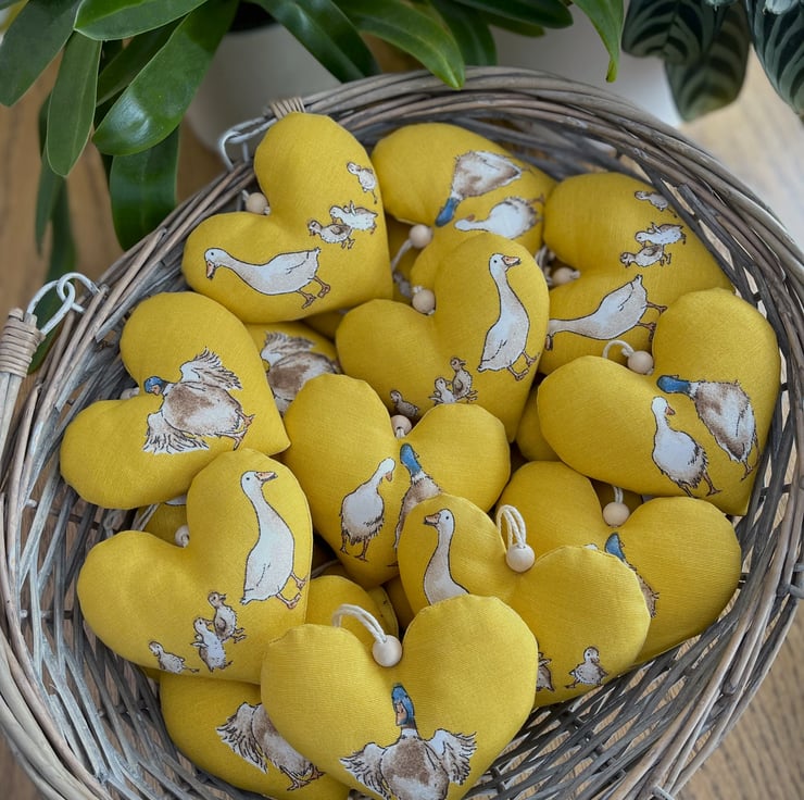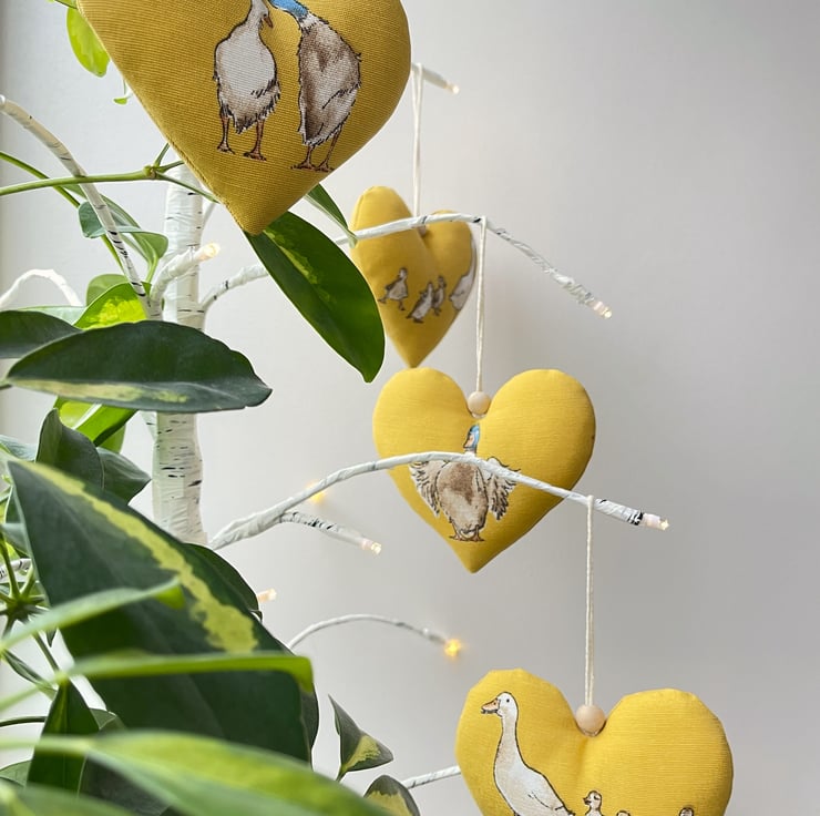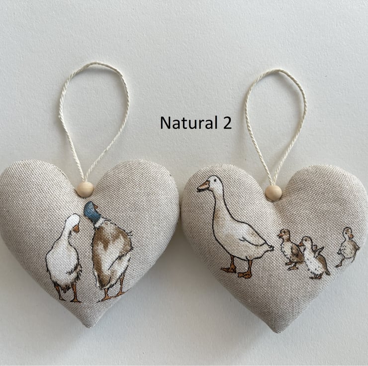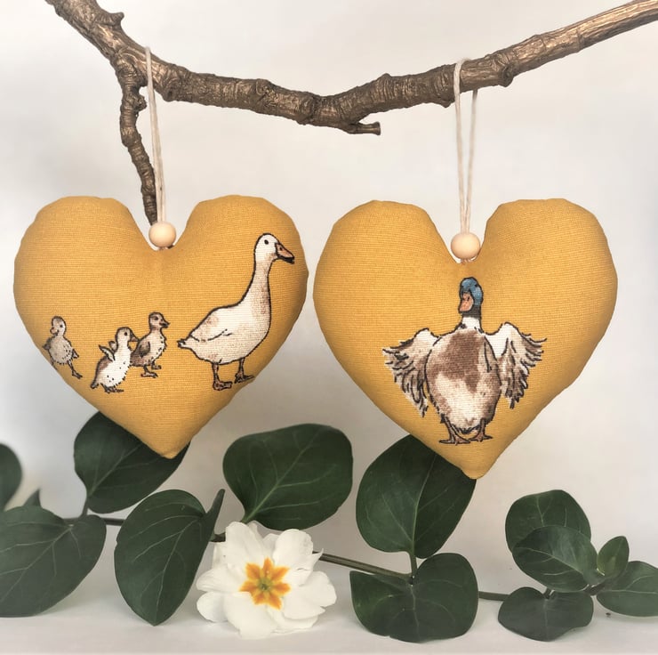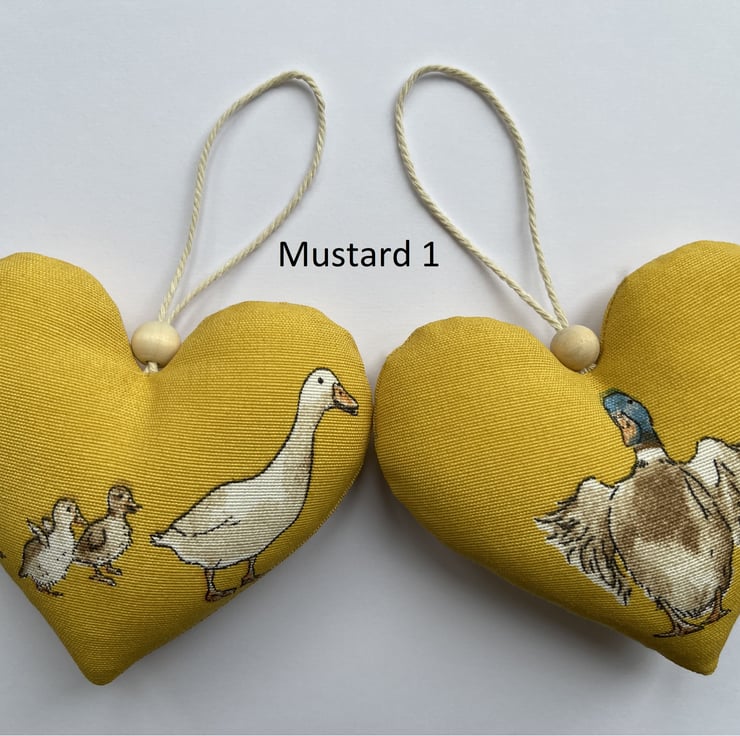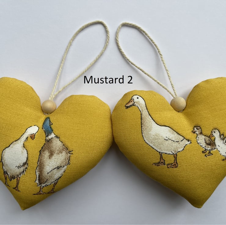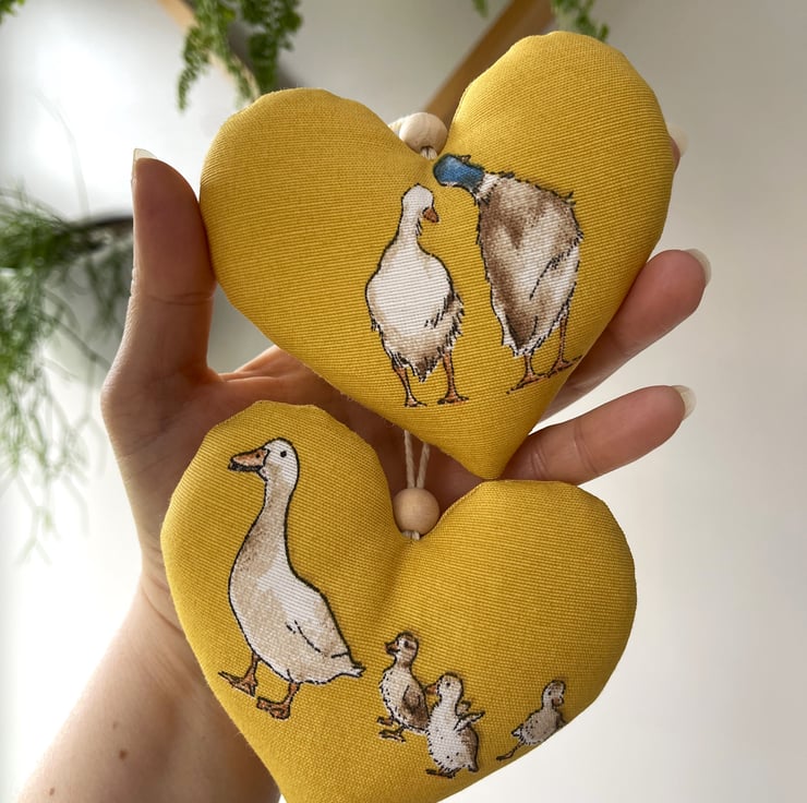 Bring a touch of countryside charm to your home with this beautifully crafted set of two heart ornaments. Made from a high-quality linen-cotton blend, these hearts feature delightful duck and goose illustrations on a choice of warm mustard yellow or natural beige fabric. Thoughtfully finished with a wooden bead and cotton string, they add a rustic, farmhouse-inspired accent to any space.