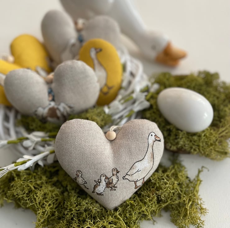 Set of 2 Linen Hanging Hearts Ducks Goose Easter Cottage Decoration Spring Decor