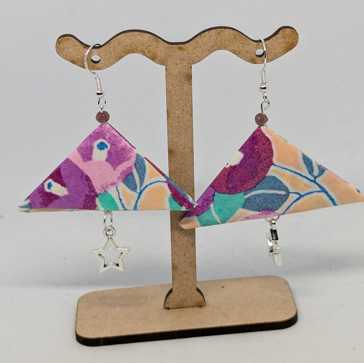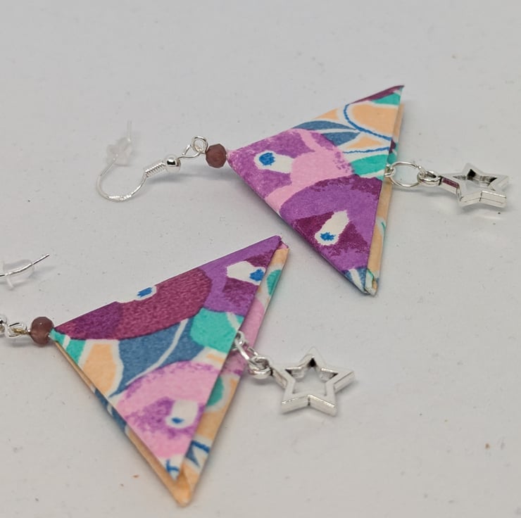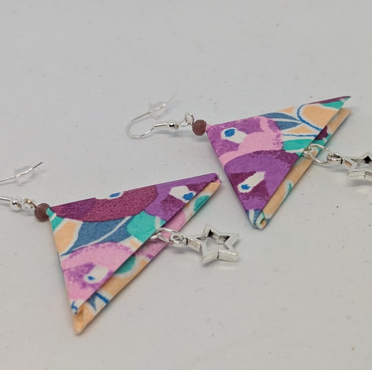 These unique earrings have been created with traditional Japanese washi paper with an elegant pattern of camelias in violet and lilac on a coral background. The paper has been folded using origami techniques with the addition of star-shaped charms to create earrings which are 5cm in length, with sterling silver ear hooks. Hand crafted and designed in Glasgow, Scotland, these earrings would be a great addition to any collection. A perfect and unique choice for a first wedding anniversary gift!