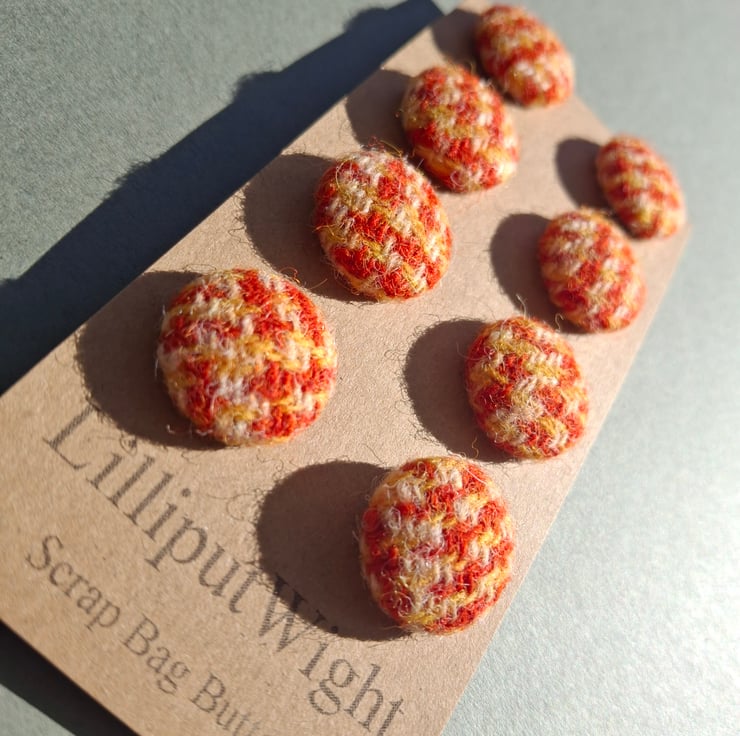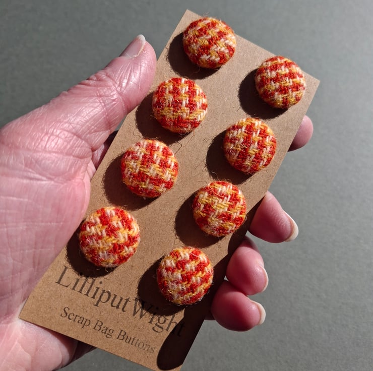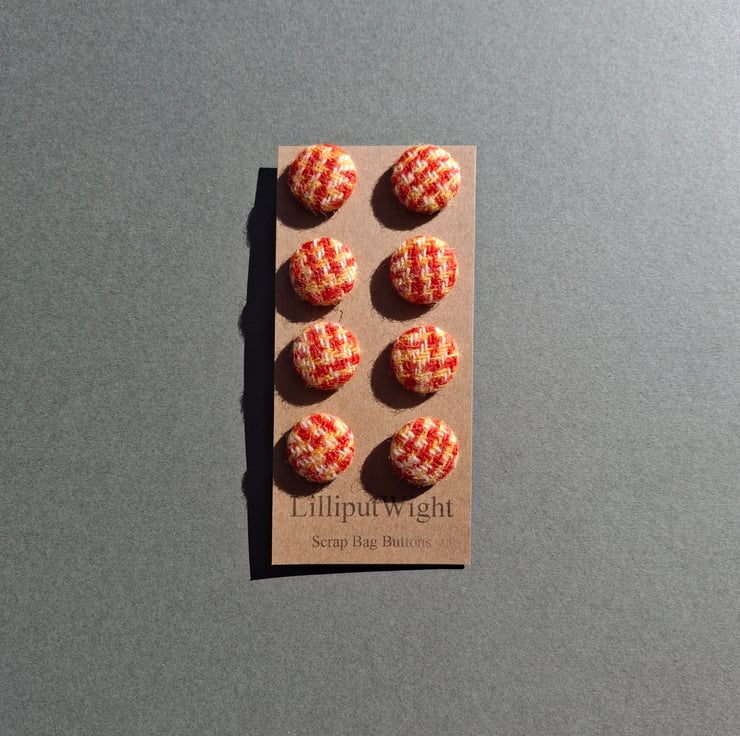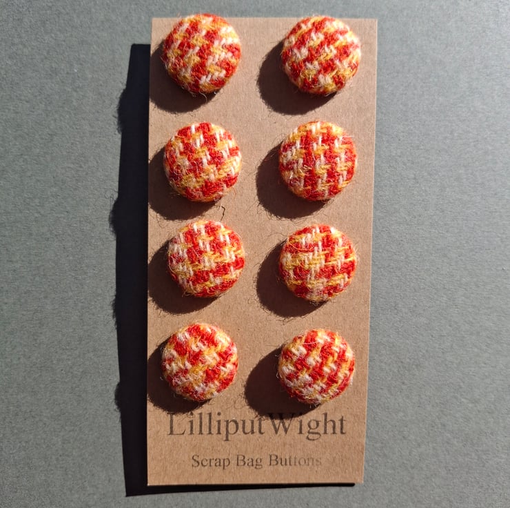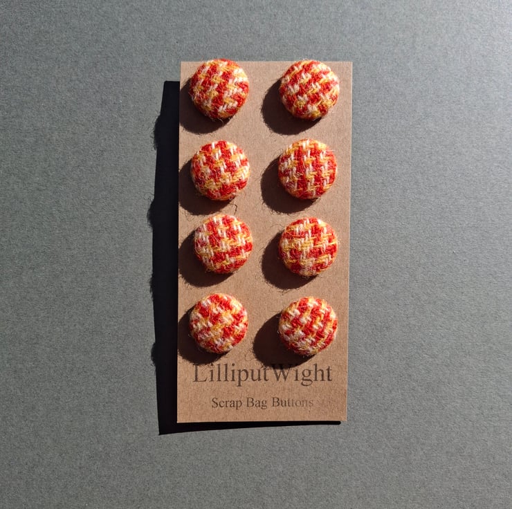 This set of eight buttons are metal buttons covered with scraps of Harris Tweed fabric in orange and yellow. Each button is around 2cm across.