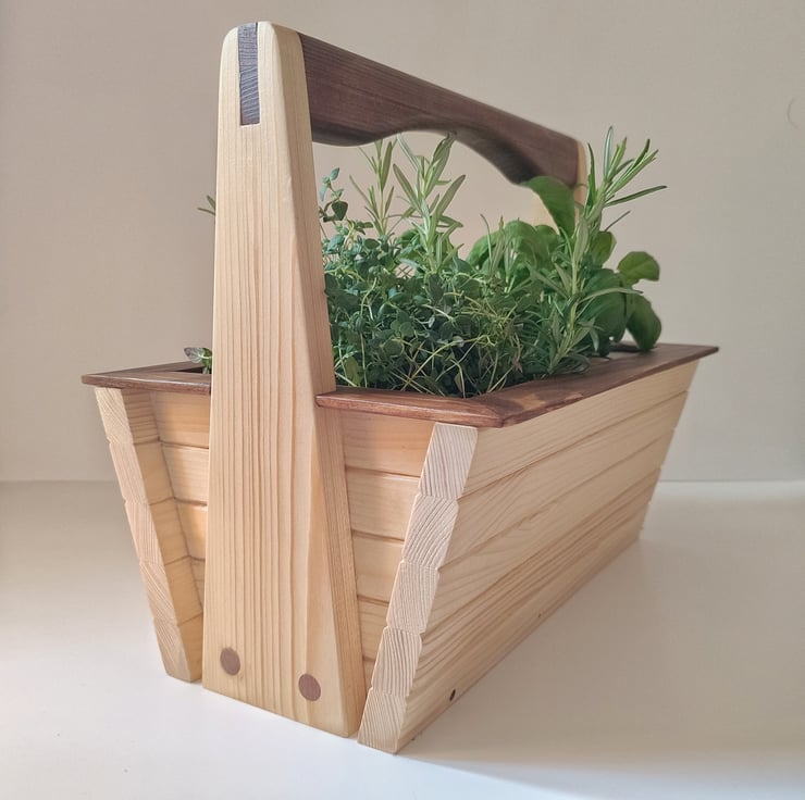 I wanted to design a slick, neat, original garden trug that could be used as a planter. I wanted it to show attractive joinery and no mechanical fixings so after some hours in CAD I came up with the slatted design with a tenon handle. Who said pine couldn't be stylish?
