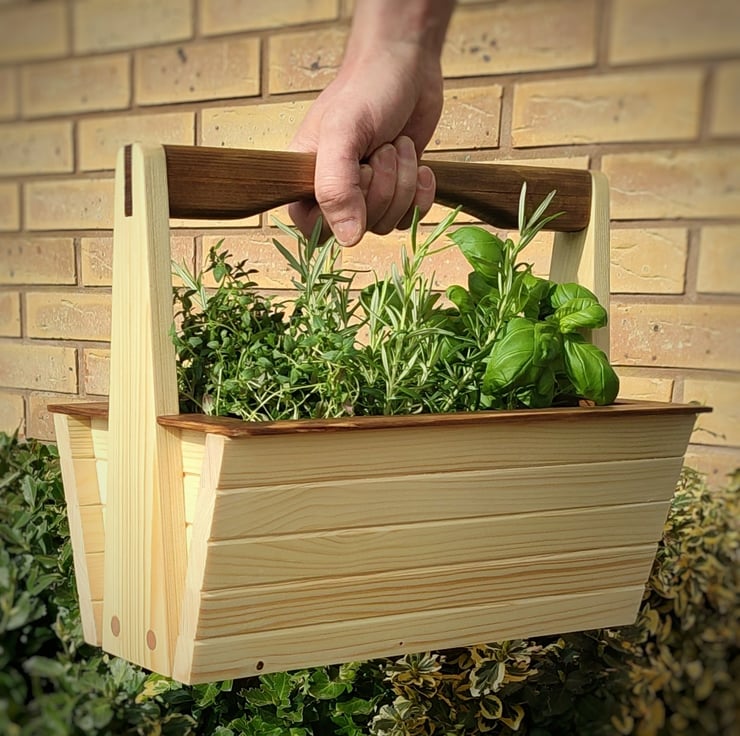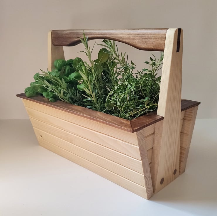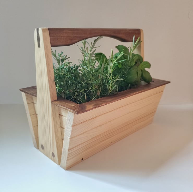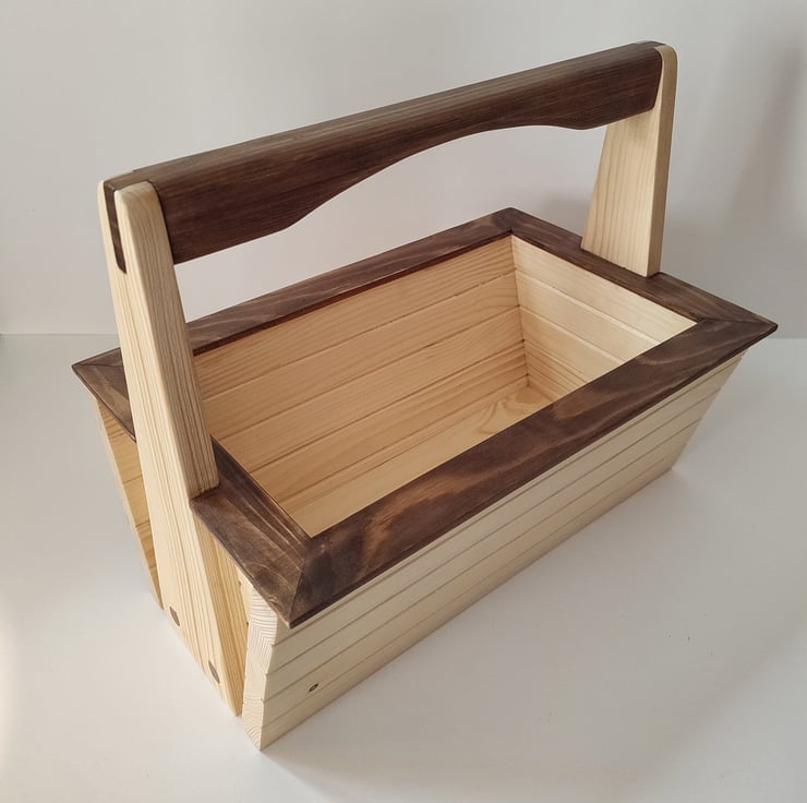 An original design, beautifully handmade garden basket suitable for use as a garden trug, or as a small planter in the kitchen or on the window sill. The baskets are made from pine, with chamfered slats and a tenon handle design. The handle and trim are stained with a dark oak.