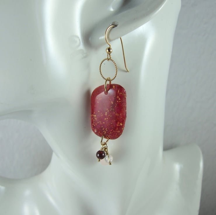 Gold Filled and Red Marbled Polymer Clay Earrings with Garnet, Rose Quartz and Rock Crystal gemstones. These are end of line as I no longer work with polymer clay.