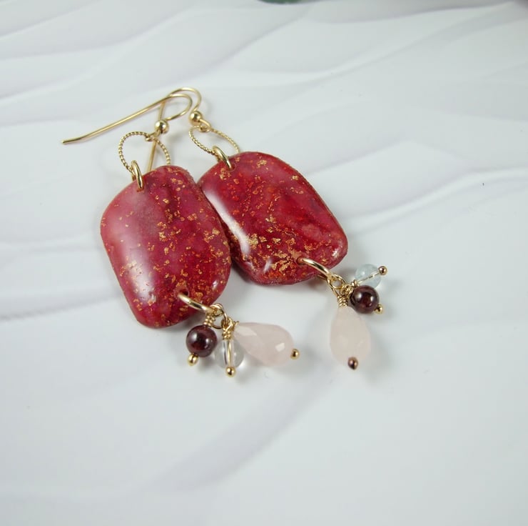 I began with the polymer clay, combining red, translucent, inks and gold leaf to create a marbled effect. Once cured I have coated in resin to protect and give a high gloss finish. To these I have added 14ct Gold Filled ear wires and beads and rings. At the bottom I have added a garnet, a faceted rose quartz and clear rock crystal all securely wire wrapped with gold filled wire. All fittings are gold filled.