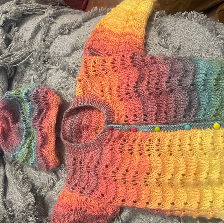 Beautiful handknitted cardigan and hat in multicoloured wool