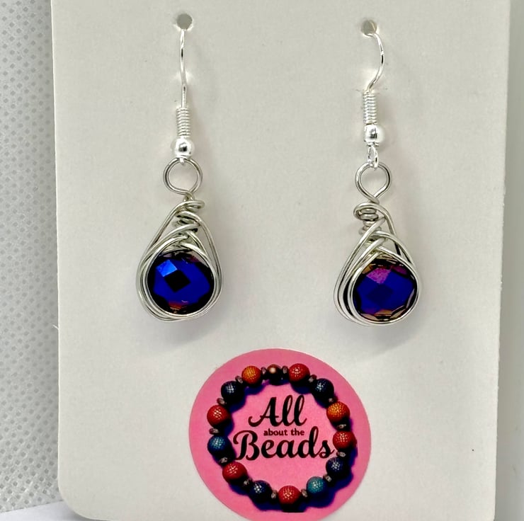 These beautiful earrings have been handcrafted using silver tarnish free wire, in the centre is a multifaceted faceted 8mm dark blue austrian crystal rondelle, the shepherd’s hook ear wire is made from Hypoallergenic sterling silver.