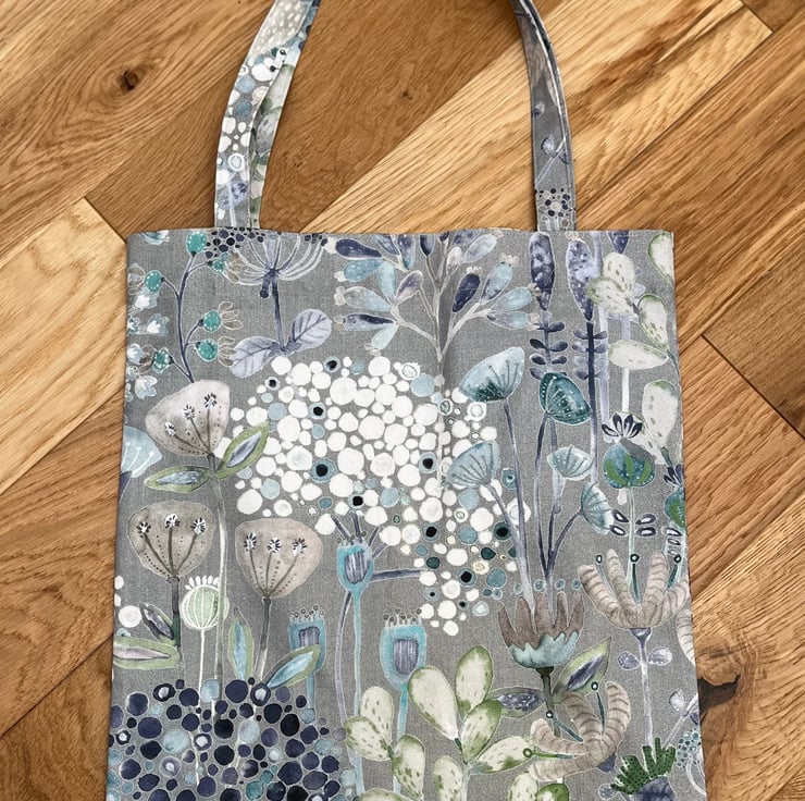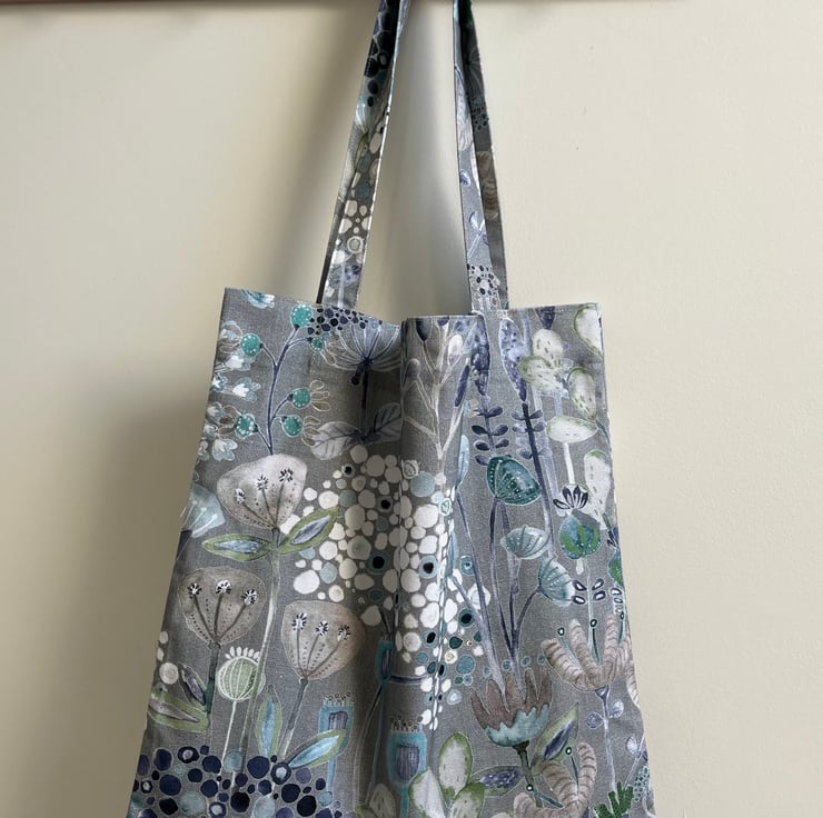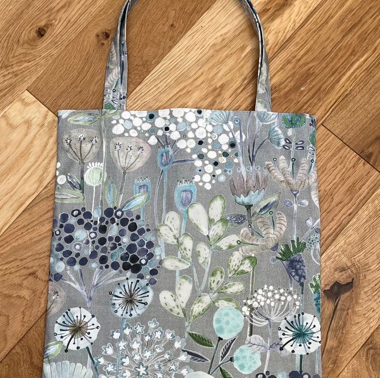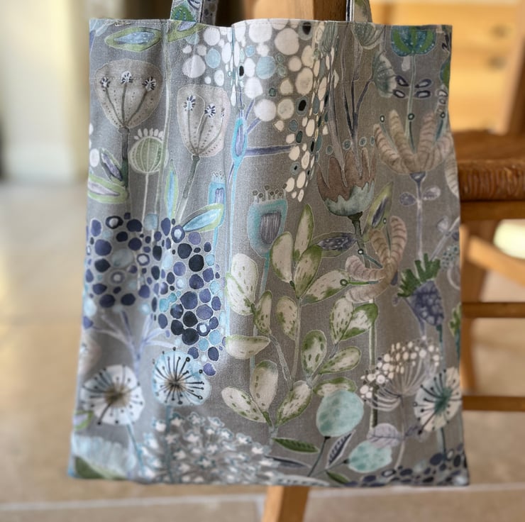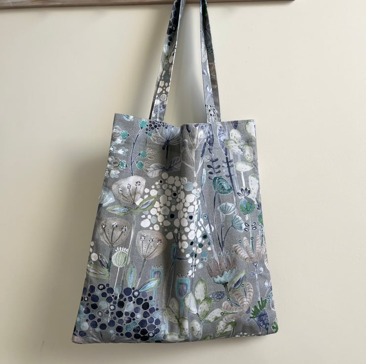 Beautiful floral cotton tote bag with pretty watercolour seed head design in shades of blue, green and grey.