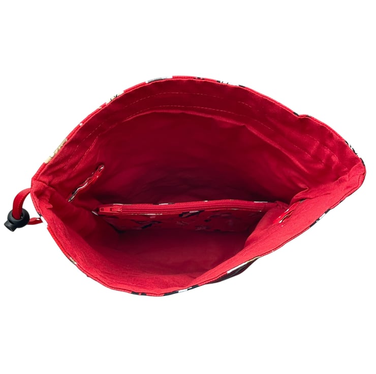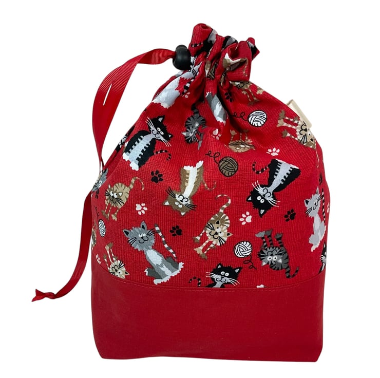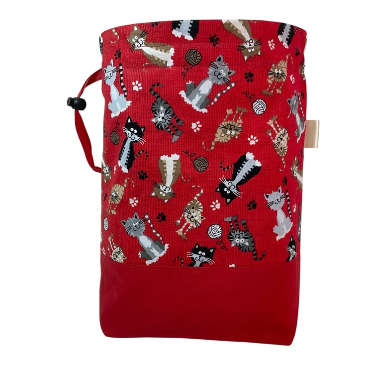This is a two at a time knitting bag, but it also could be used for other things. It has the cutest different coloured cats print cotton on a red background and I have paired it with a bright red lining and exterior accent piece. The divider inside the bag is a fixed zip pouch that has the exterior and lining matching as the main bag itself. Inside are 2 fabric matched yarn guides, fastened with snaps. The entire bag is interfaced and the base boxed so it stands up.