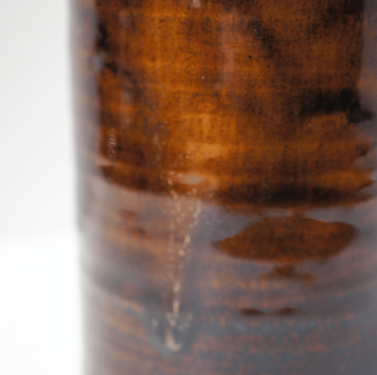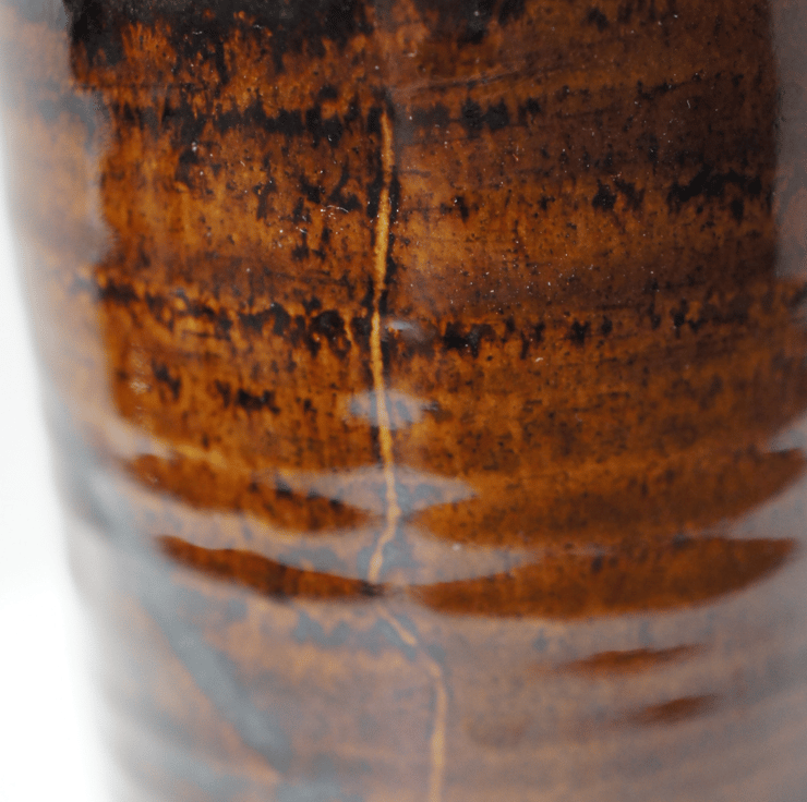 A useful stoneware pencil pot or vase glazed in iron-based brown and bronze colours.