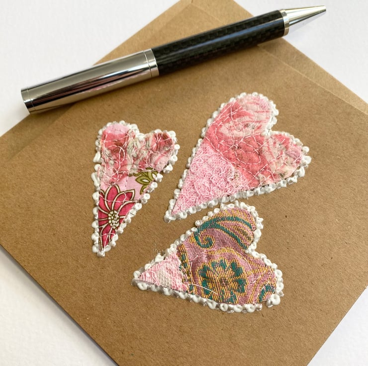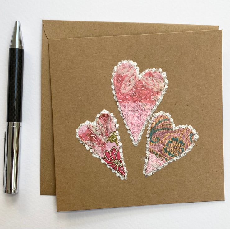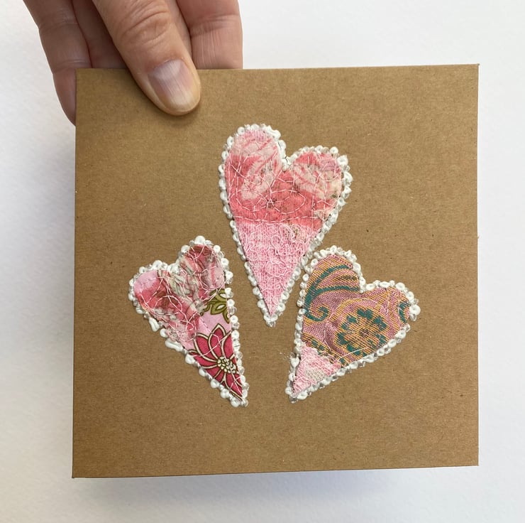 These enchanting little embroidered pink hearts have been made with up-cycled fabrics, threads, lace, framed with 3-D paint and enhanced with free motion embroidery. Try he card is perfect for Valentine’s Day, wedding card, anniversary card, Mother’s Day or for a very special occasion. It is blank inside. The recycled brown card measures 13.5 x 13.5cm, comes with an envelop and in a plastic cover for protection.