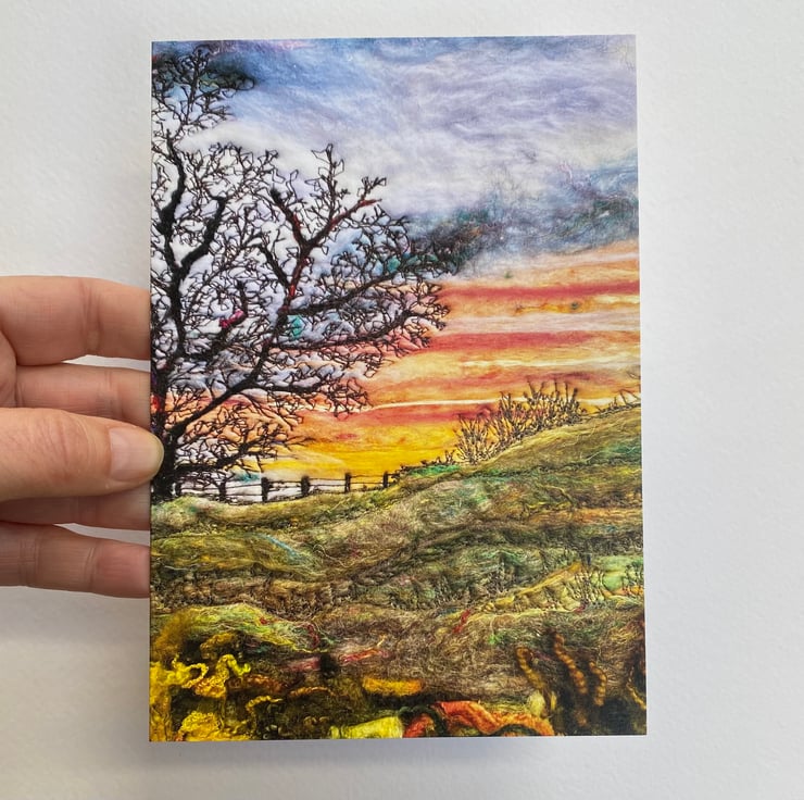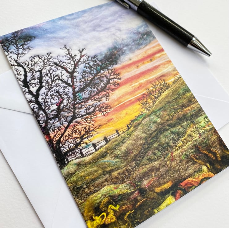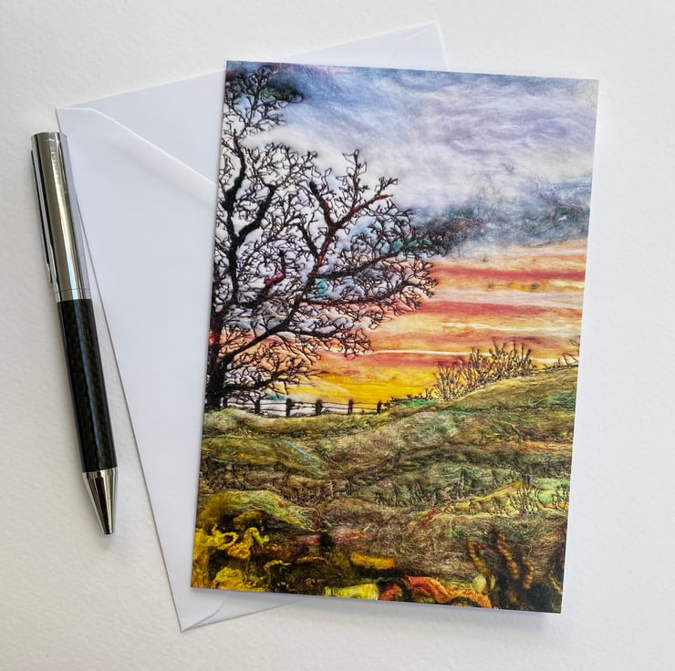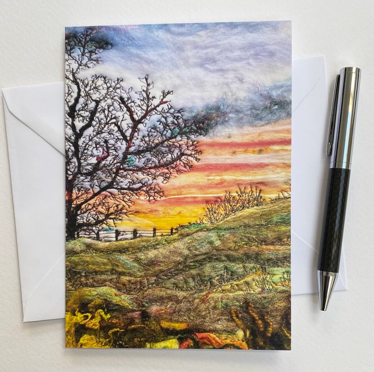 This card is a print of one of my free motion wet felted landscapes of Yorkshire. This one shows the sunrise across a hill from behind a tree. It’s blank inside making it ideal for any occasion. The card measures 12.5 x 18cm and it comes with an envelop in a plastic cover for protection.