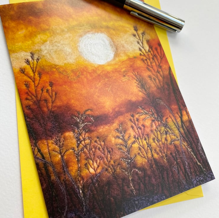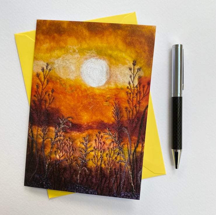 This card is a print of one of my free motion wet felted landscapes of Yorkshire. This one shows a summers sunset through plants. It’s blank inside making it ideal for any occasion. The card measures 12.5 x 18cm and it comes with an envelop in a plastic cover for protection.