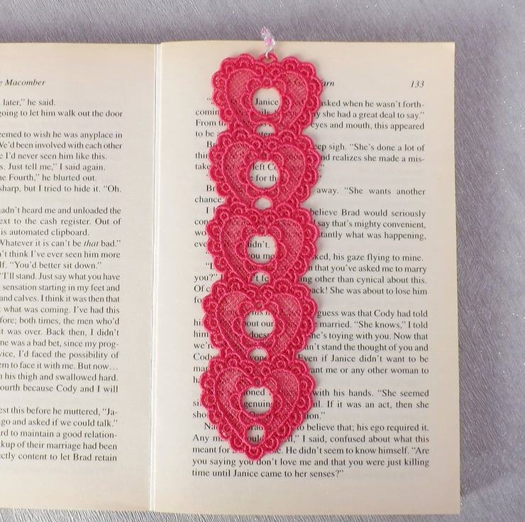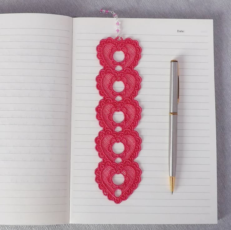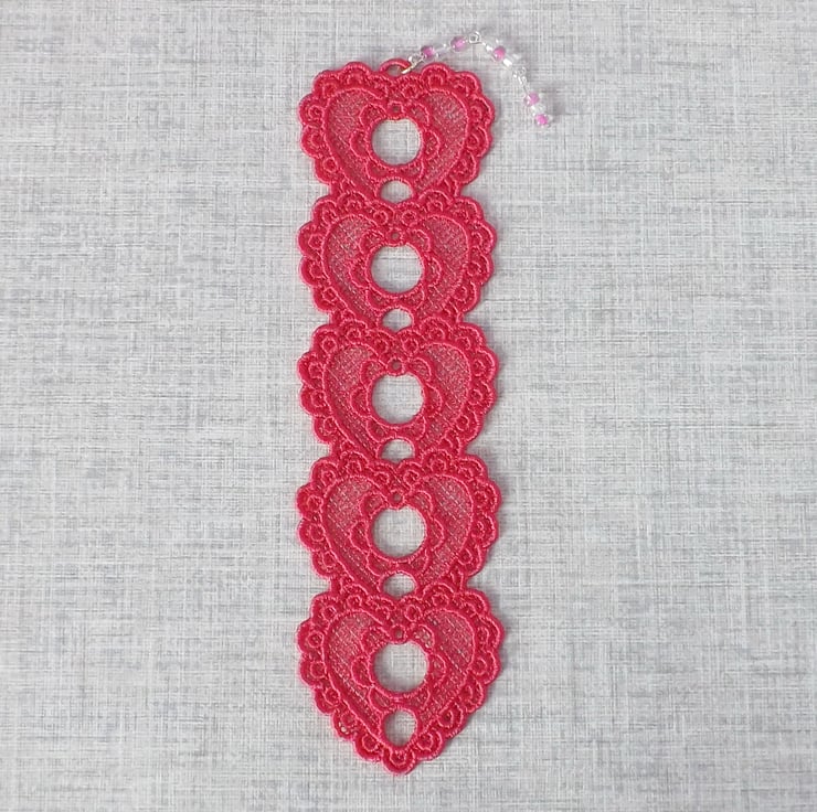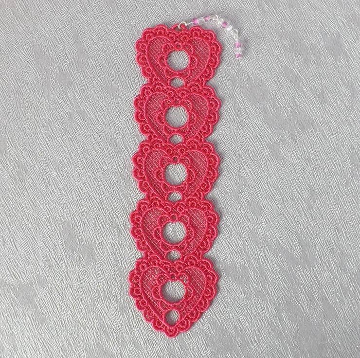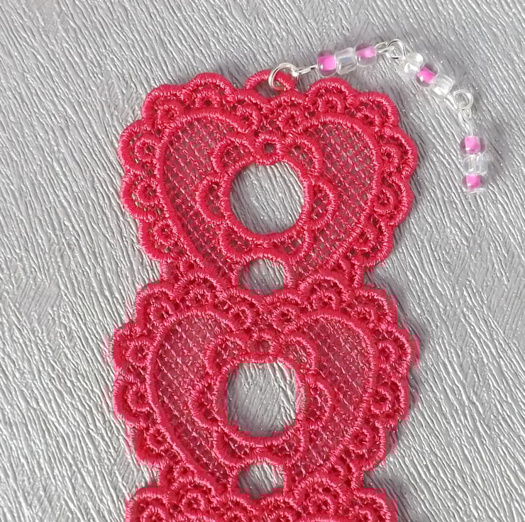 Embroidered lace heart bookmark, made with pink coloured machine embroidery thread, with a pretty bead charm.