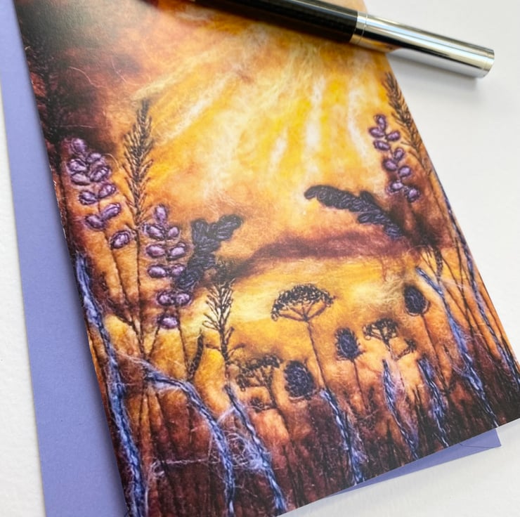 This card is a print of one of my free motion wet felted landscapes of Yorkshire. This one shows a sunlight through plants. It’s blank inside making it ideal for any occasion. The card measures 12.5 x 18cm and it comes with an envelop in a plastic cover for protection.