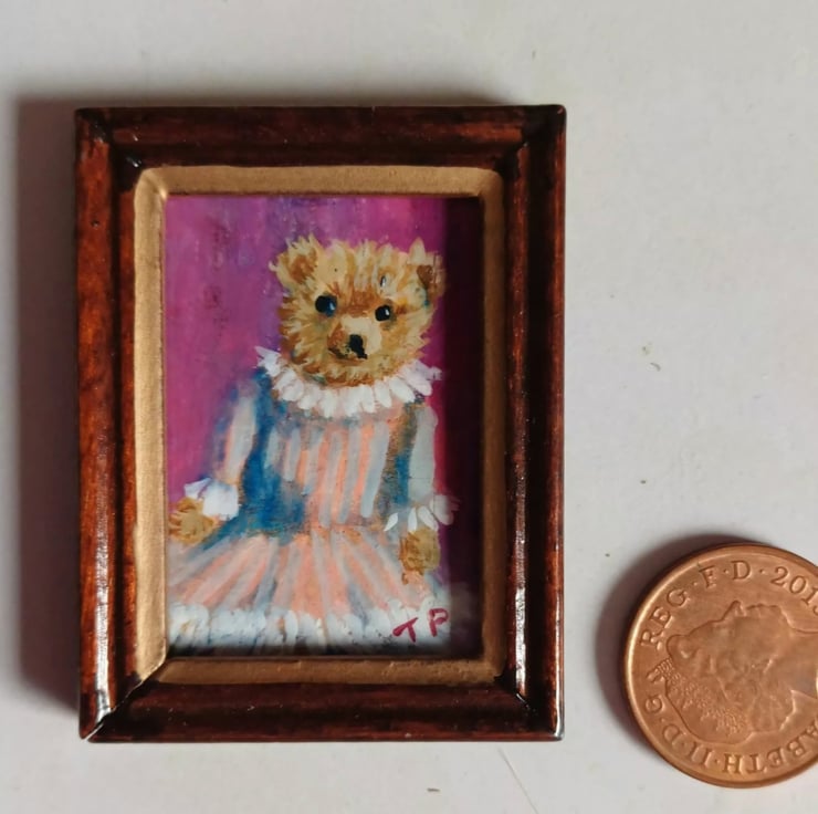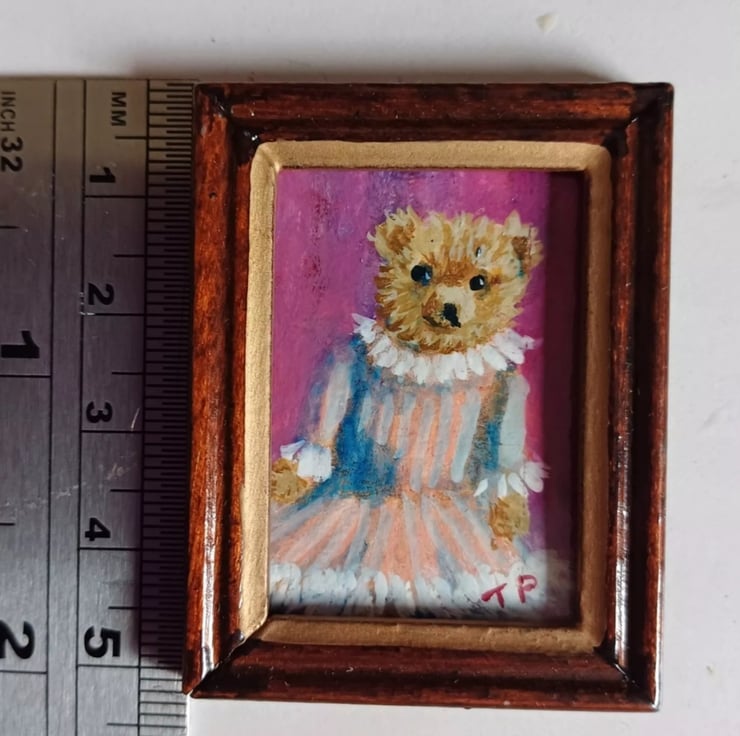 An original oil painting of a 'Pretty in Pink' Teddy Bear. Painted by me using oil paints on my handmade art board, varnished and in a wooden frame.