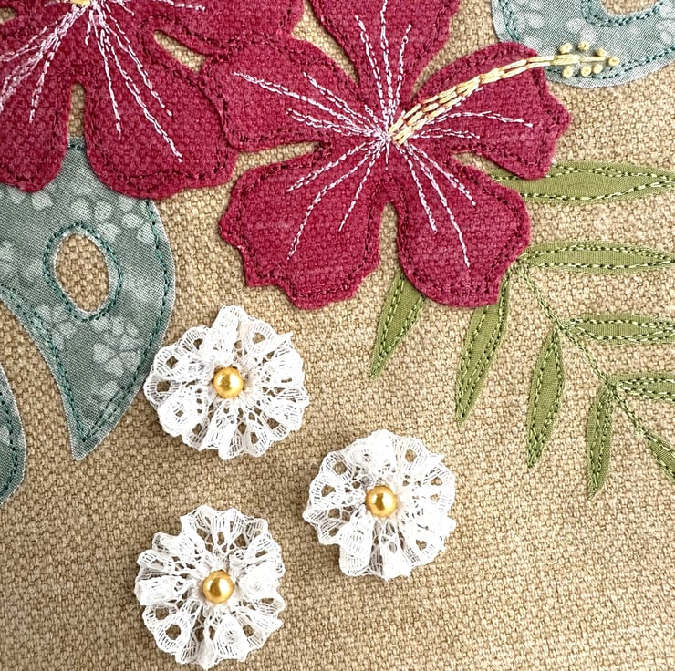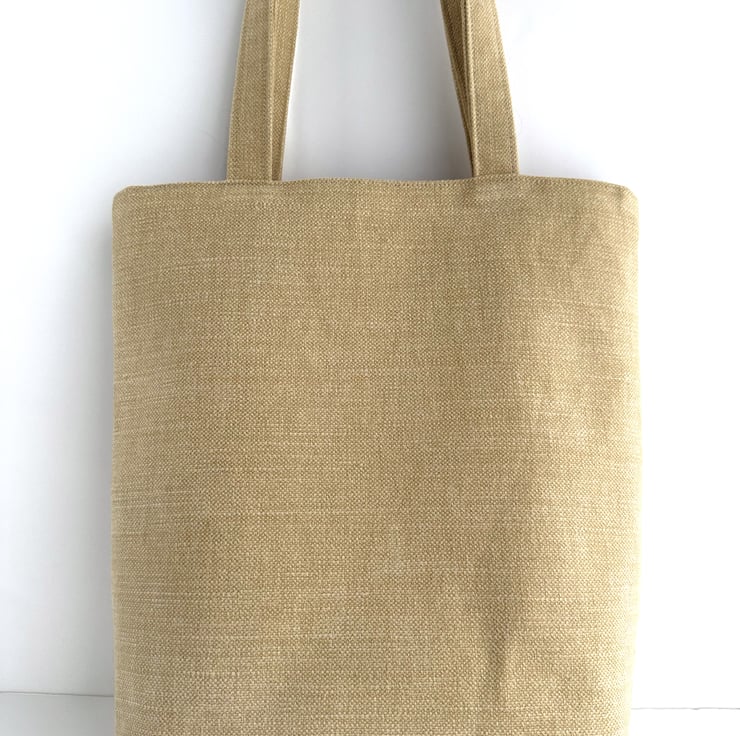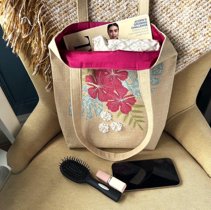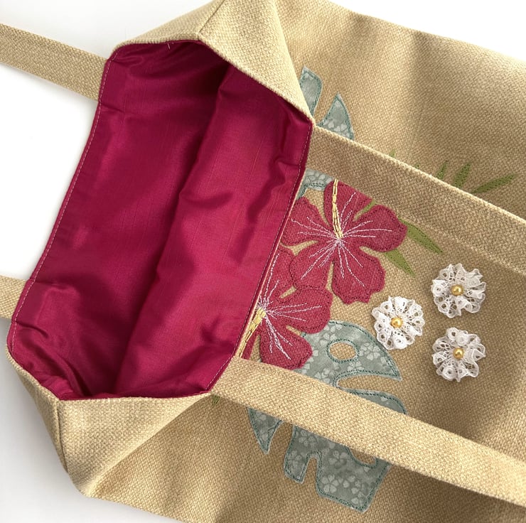 A tropical themed tote bag in a golden-beige upholstery fabric with an appliqué design featuring a cluster of hibiscus flowers amongst monstera leaves and other foliage. The hibiscus flowers are made from vibrant deep pink upholstery fabric. I’ve used free-motion machine embroidery to add pale pink shading to the petals. The yellow pistils in the centre of the flowers have been hand-embroidered. The monstera leaves are made from a lovely pale blue-green mottled fabric with a subtle print pattern of tiny flowers. There are also sprays of zesty green leaves. I’ve added three hand-made white lace flowers with yellow faux pearl centres. The bag is lined with deep pink fabric with a lovely sheen.