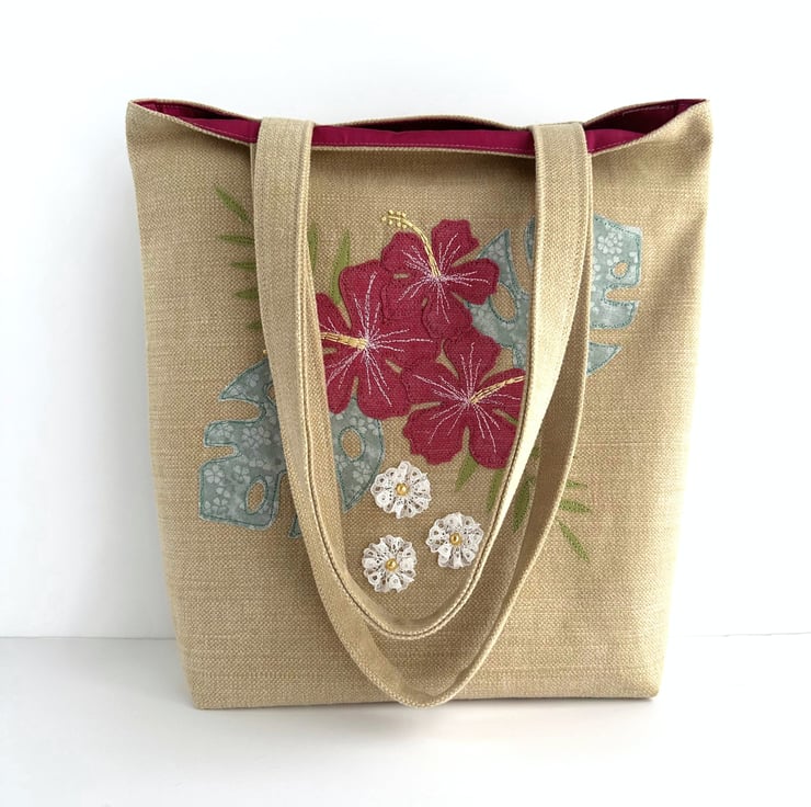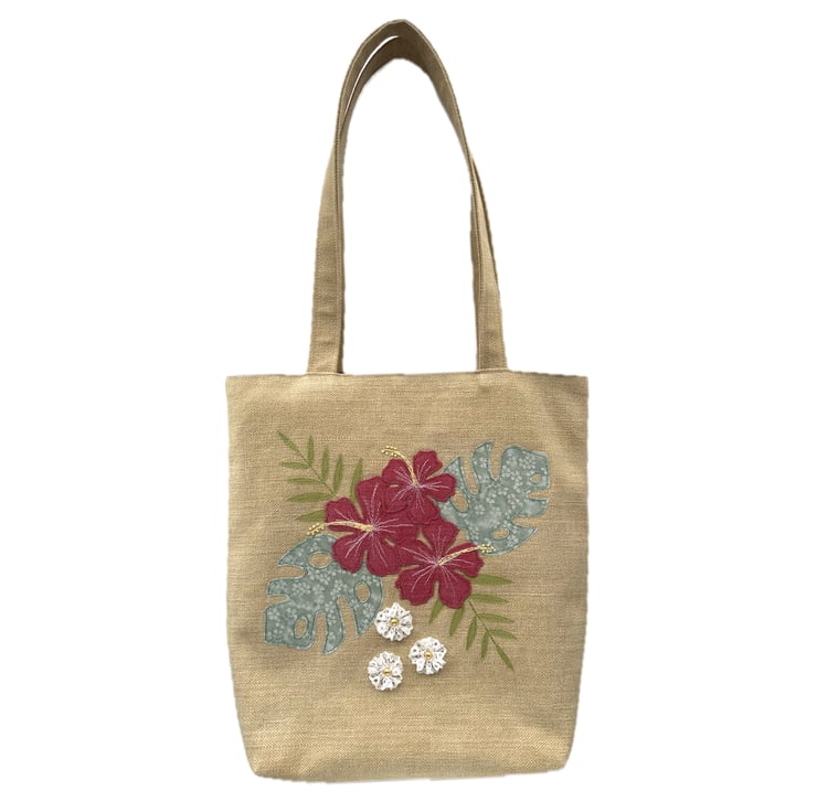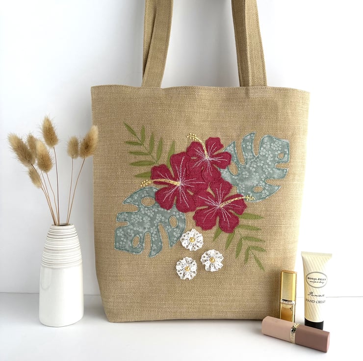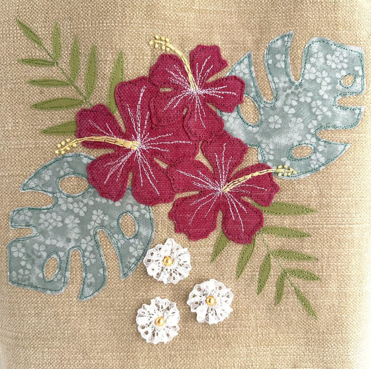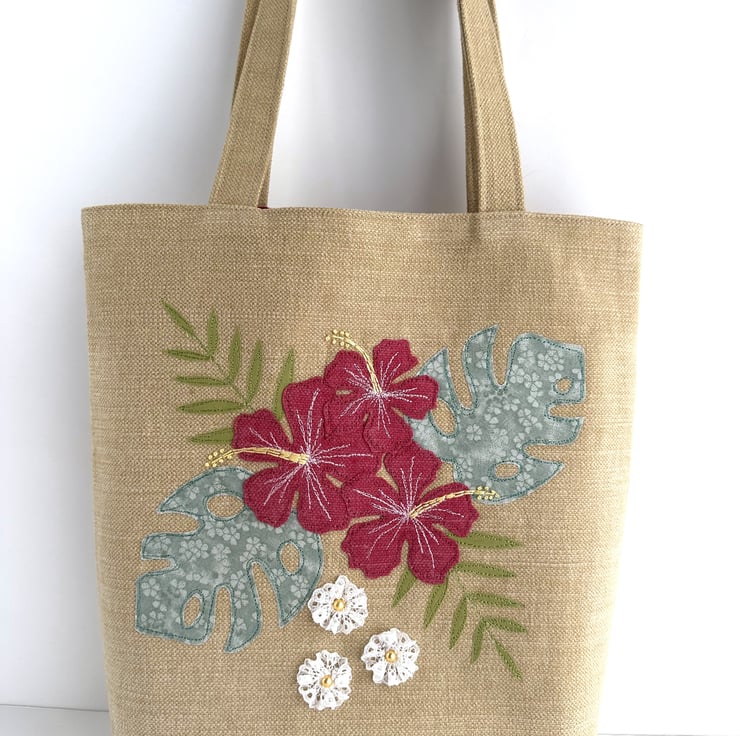 This delightful tropical tote bag is both pretty and practical, handy for all sorts of occasions. With its unique appliqué design, it would make a lovely gift for anyone who loves hibiscus and monstera.