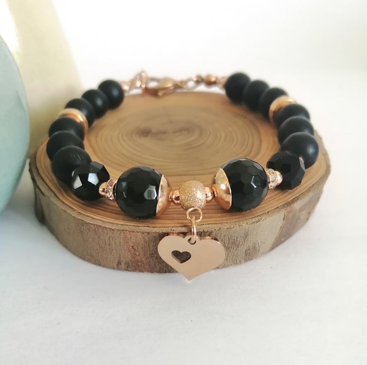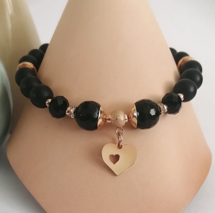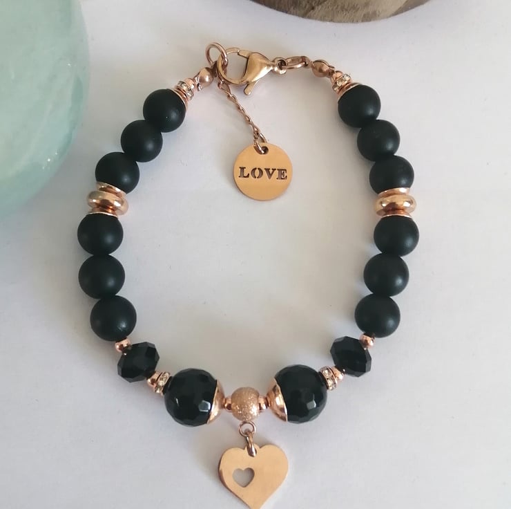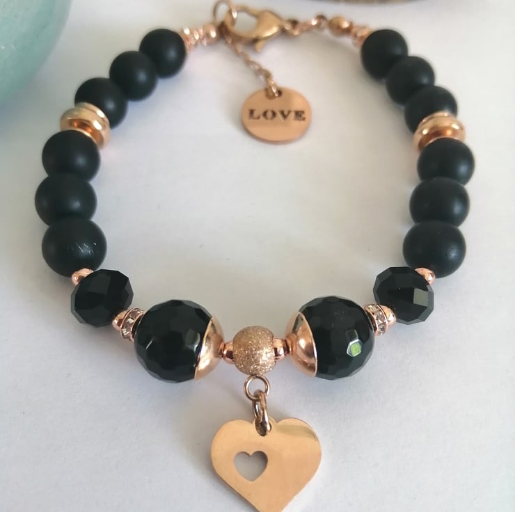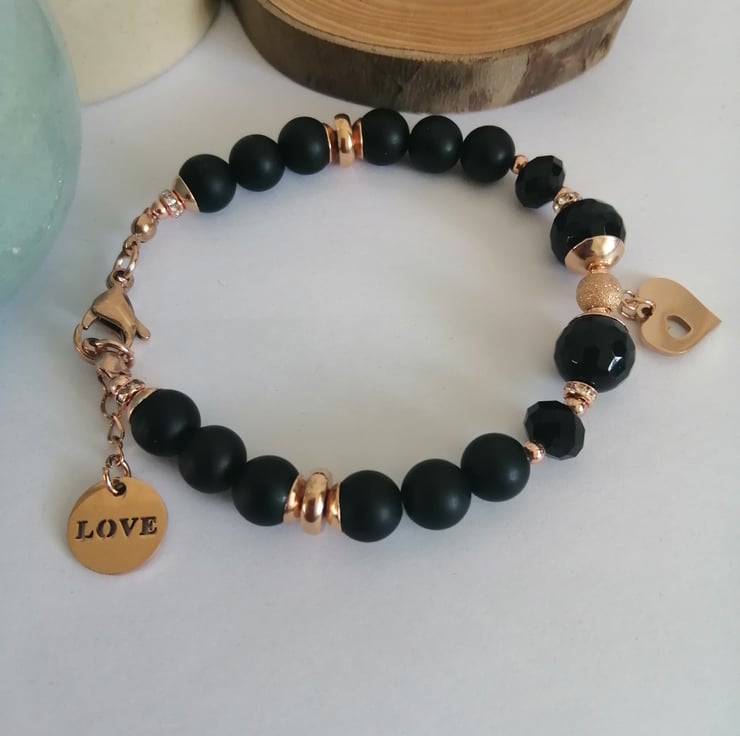 An Elegant black and rose gold bracelet with tiny subtle rhinestone beads to add a little sparkle to your day or evening.