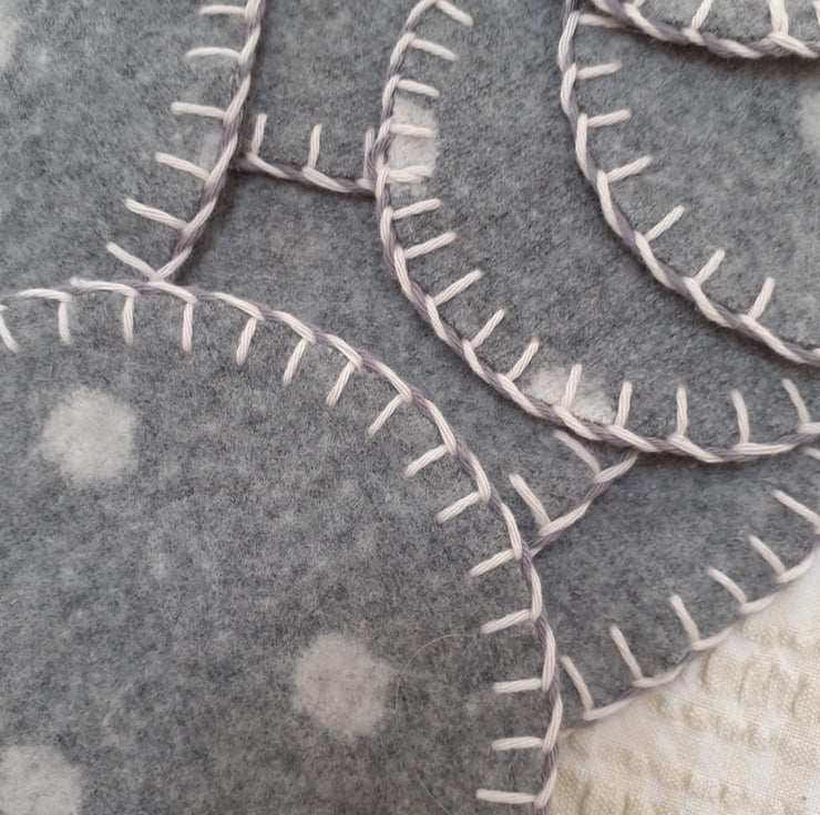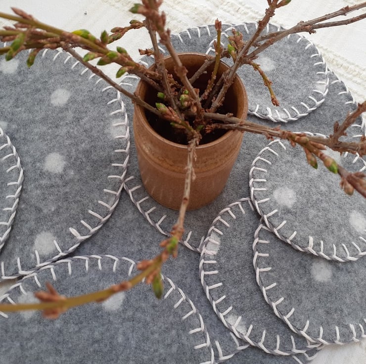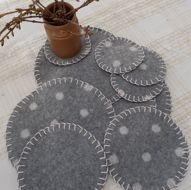 Felted cashmere jumper upcycled as a unique set of placemats, tablemats and coasters, bordered with hand-sewn cotton blanket stitch.