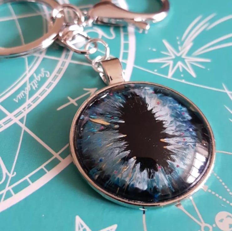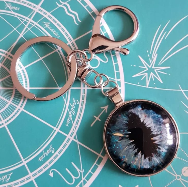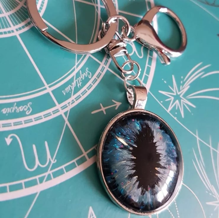 Handpainted Cats Eye Effect 25mm Glass Cabochon Silver Tone Metal Keyring. Individual One off Design.