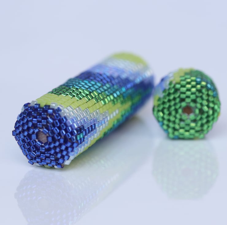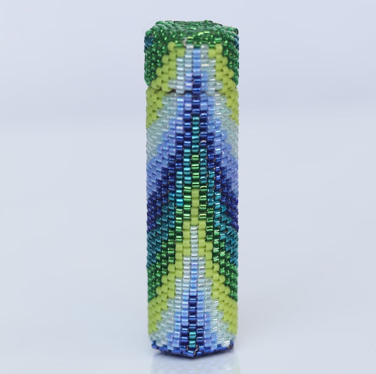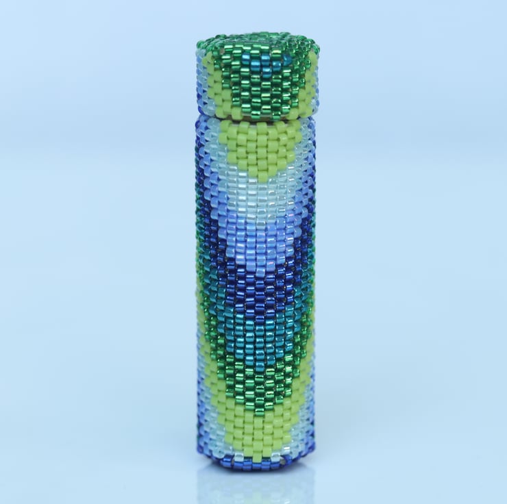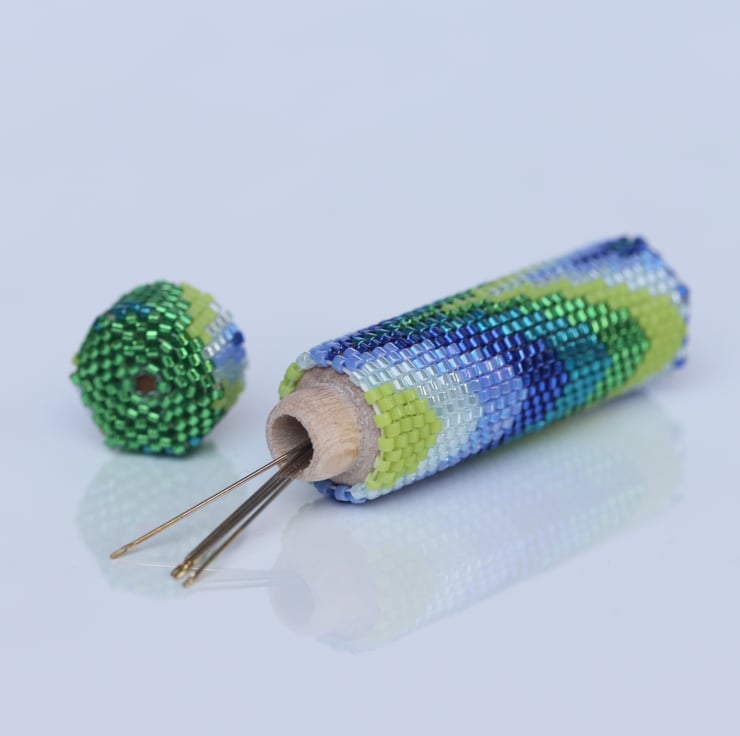 I have taken a wooden tube with a lid and beaded around it in the colours of the waves to make this pretty needlecase. It would make a lovely present for a needleworker, or how about treating yourself? It will help prevent accidental stabs when you are rummaging through your needlework supplies.