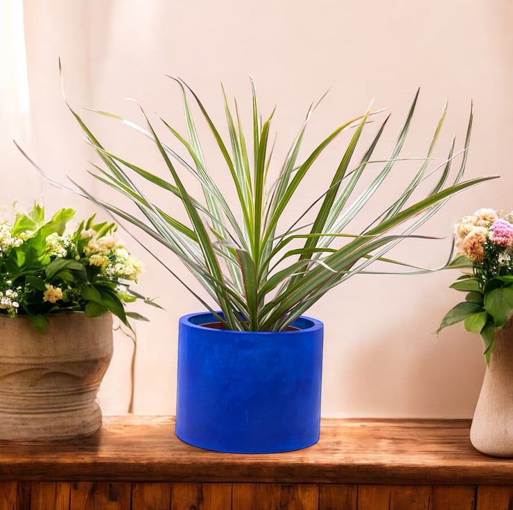 I crafted this Prussian blue plant pot from a high-quality outdoor plaster known as Cassini's. This material is often used for sculpting as well as marble and stone restoration, providing the pot with a smooth, luxurious finish that resembles marble. It is also water and weather-resistant. To achieve the vibrant colour, I added plaster pigment to water before mixing it with the Cassini's, which ensures that the pot is solid blue throughout, not just on the surface.