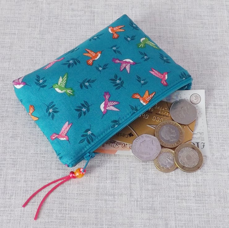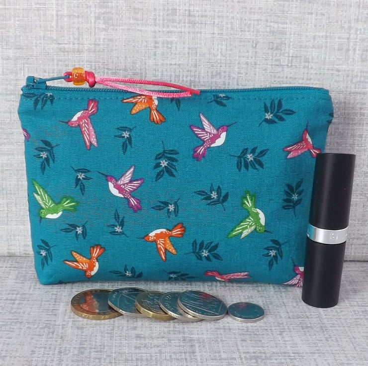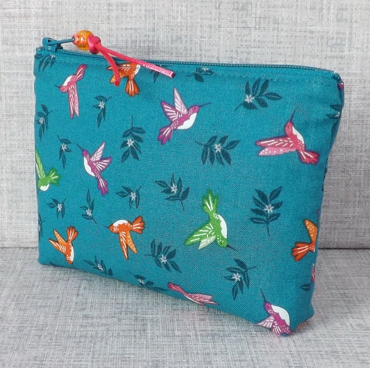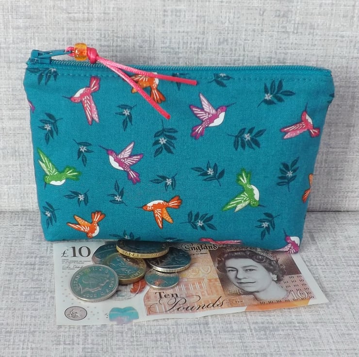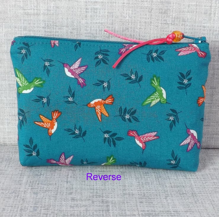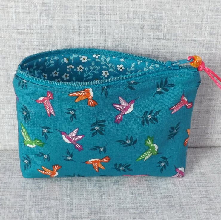 A large size coin purse made from cotton fabric with a humming bird design in shades of pink, orange & green on a teal background. The lining is a teal and white coloured floral cotton fabric.