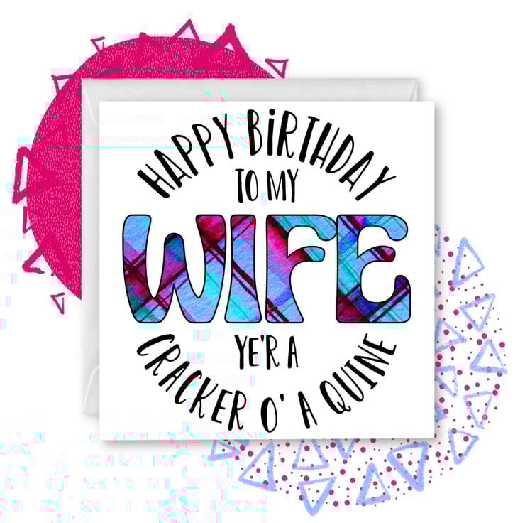 Happy Birthday Wife Bozeys original Doric Greetings Cards. Measuring 6x6" or 15x15cm, with a high quality, textured white envelope, these fabulous Doric greetings cards are printed on gorgeously glossy 260gsm photo-quality card. They are blank inside for your own message, and have a lovely wee tagline on the back (a bozey is a warm hug).
