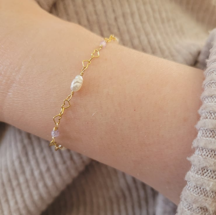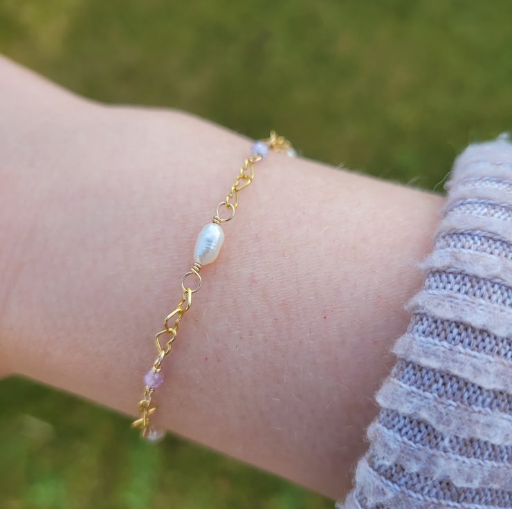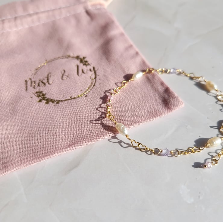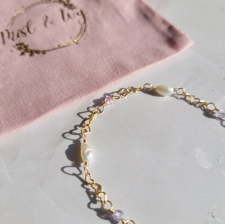 This delicate bracelet is handmade with freshwater pearls, and pale pink and purple cubic zirconia beads. The beads and pearls have been carefully wire wrapped onto a dainty 14kt gold filled heart shaped chain. The bracelet has a spring ring clasp and an extension chain giving a variable length of 17-20cm.