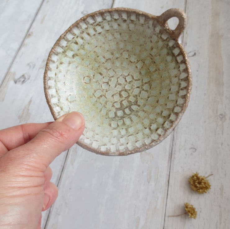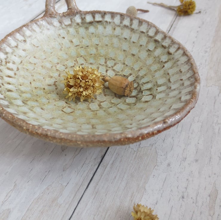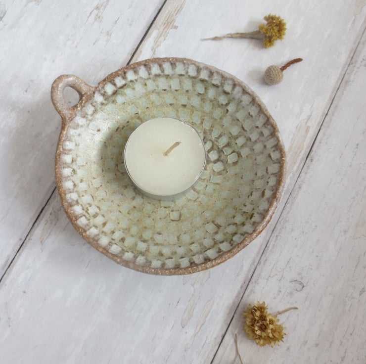 Beautiful tripod tealight or candle holder hand built from textured crank, buff coloured clay.