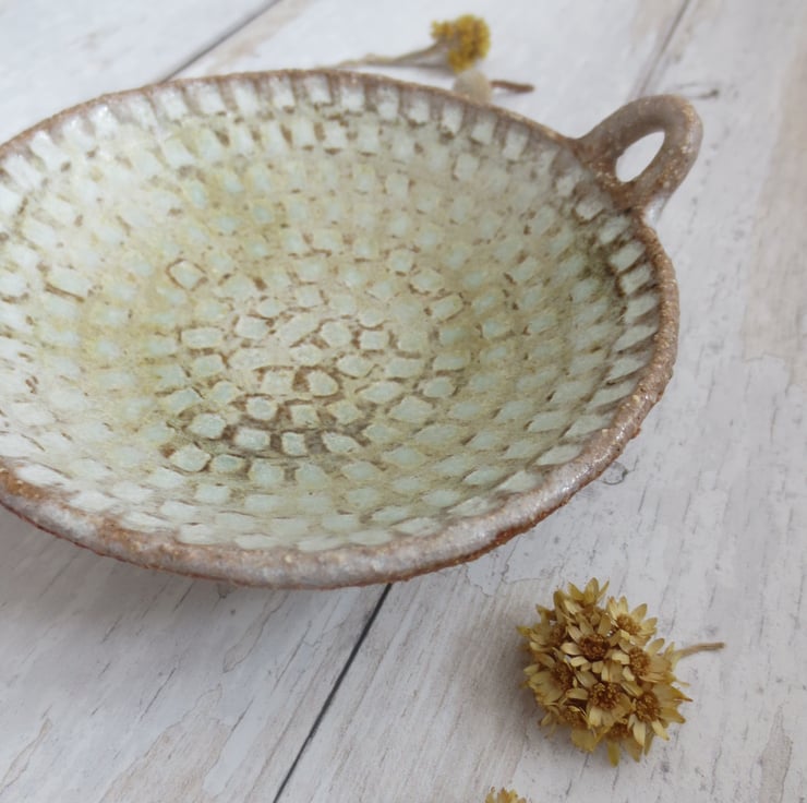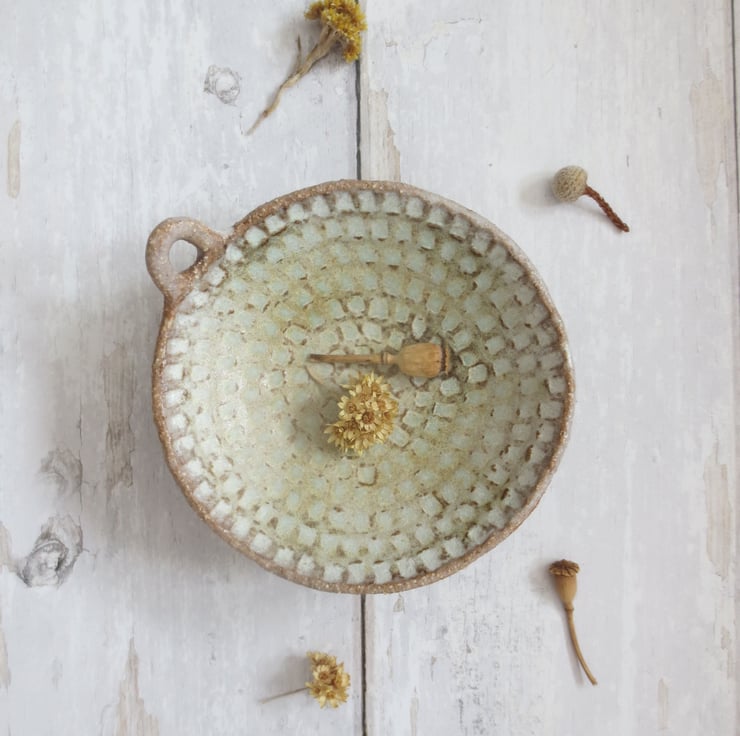 Fired to stoneware temperature (1280C) with a satin white glaze over a reactive oxide slip that has been carved for added texture and interest.