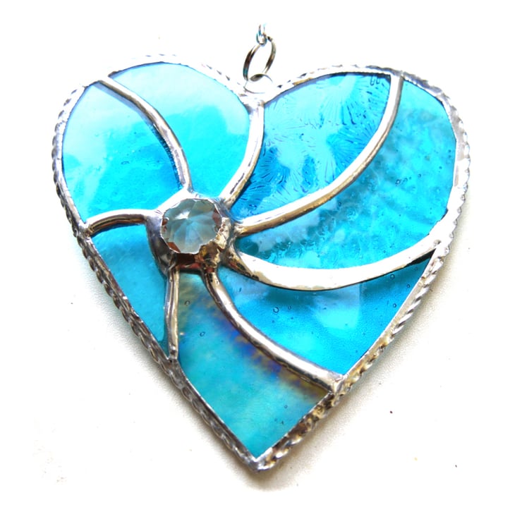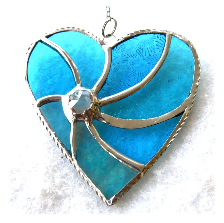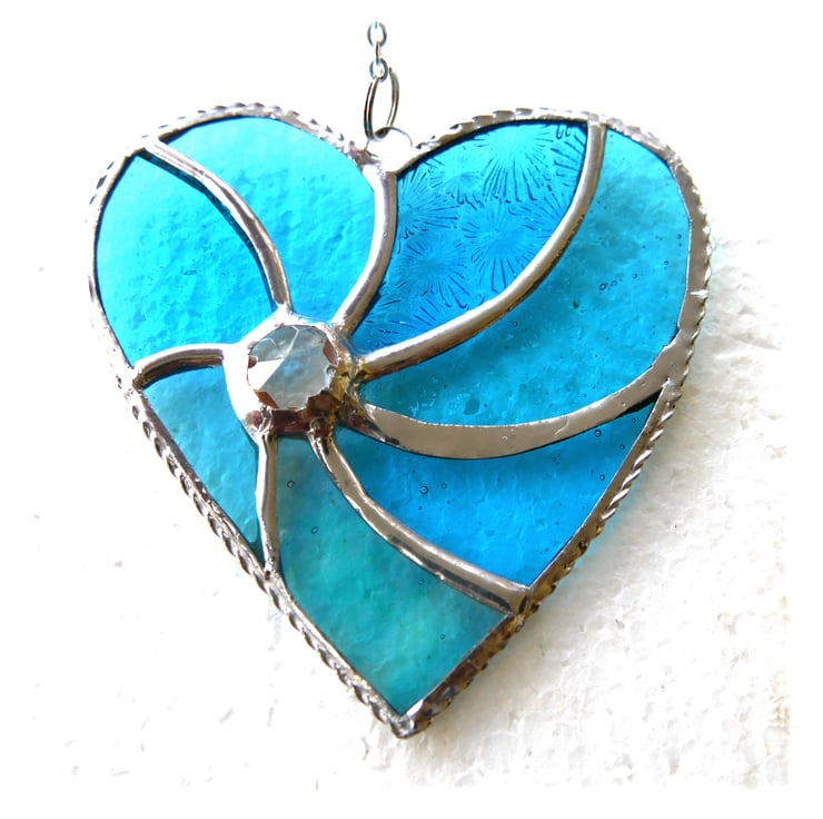 I've made the heart from 7 types and colours of glass, gorgeous turquoise, textures and iridescence and I've set them in a swirl round a sparkling crystal.