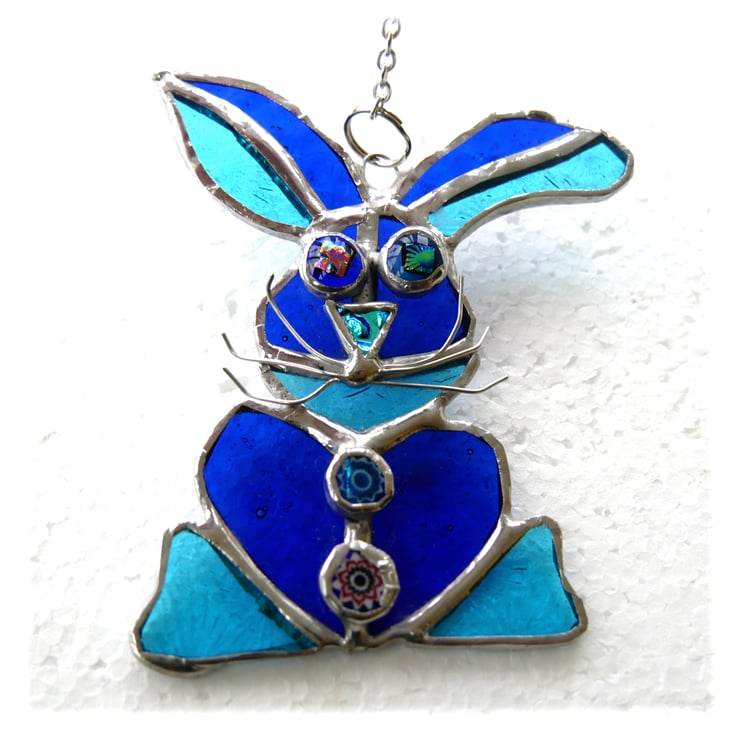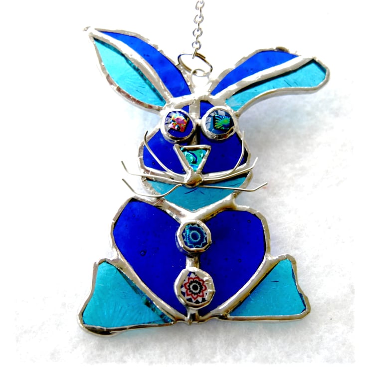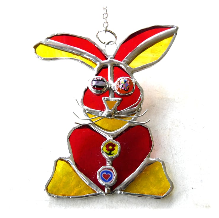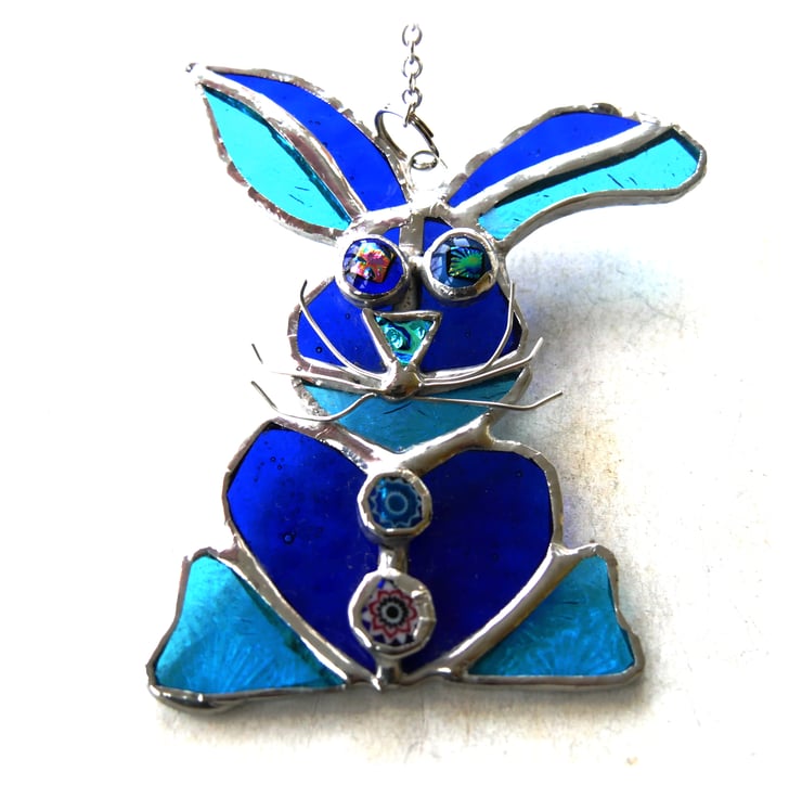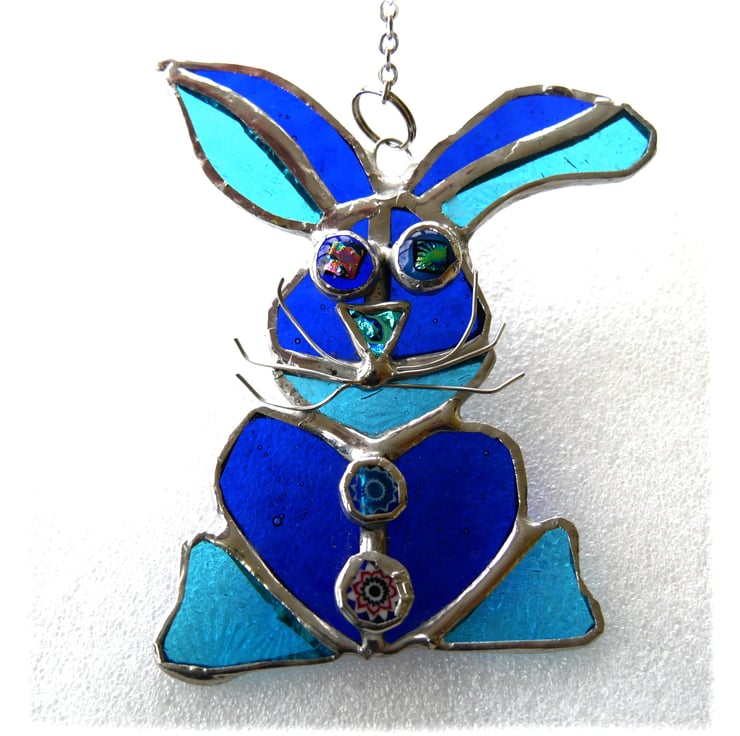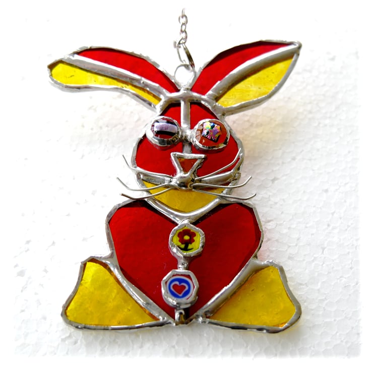 My bunnies have floppy ears, eyes made from dichroic glass topped nuggets I fused in my kiln, a heart shaped body and millefiori flowers for buttons.