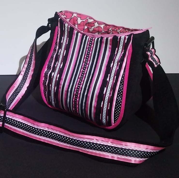 A black chunky corduroy over laid with pink, black and white ribbons to create a fabulous patterned back, this also is piped with hot pink corduroy.