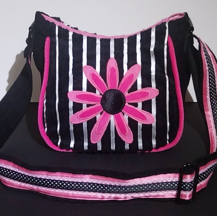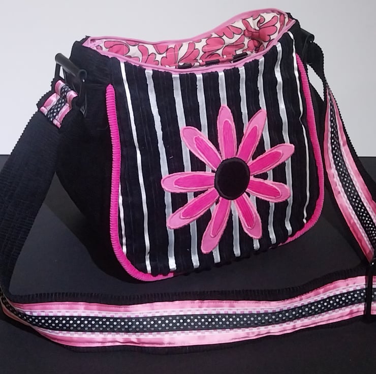Is a chunky black corduroy with white satin ribbon stripes, then a striking pink daisy with a black velvet padded center made to be simple (for a change) yet effective. the panel is piped with a pink corduroy.