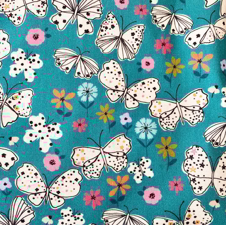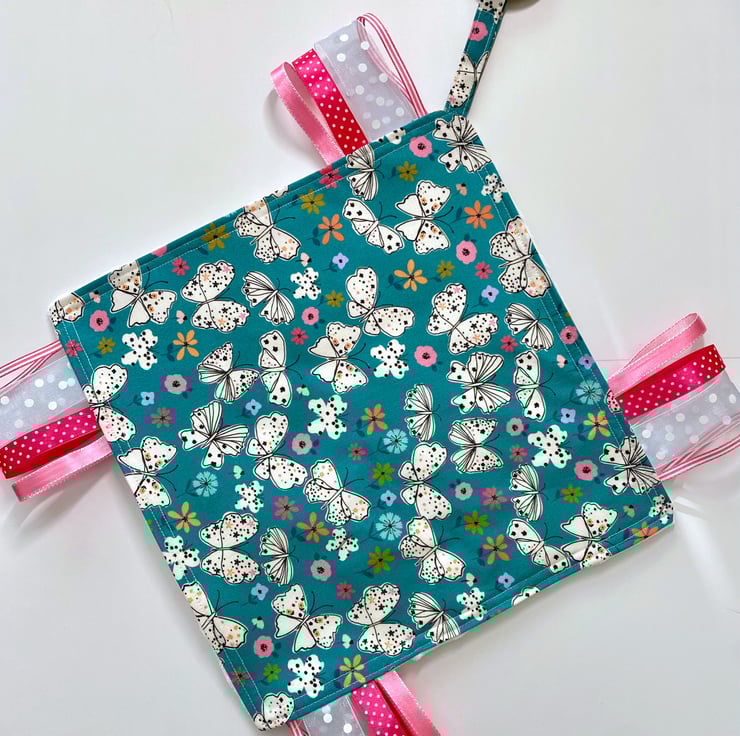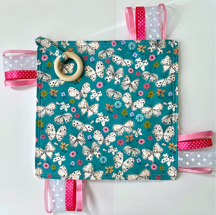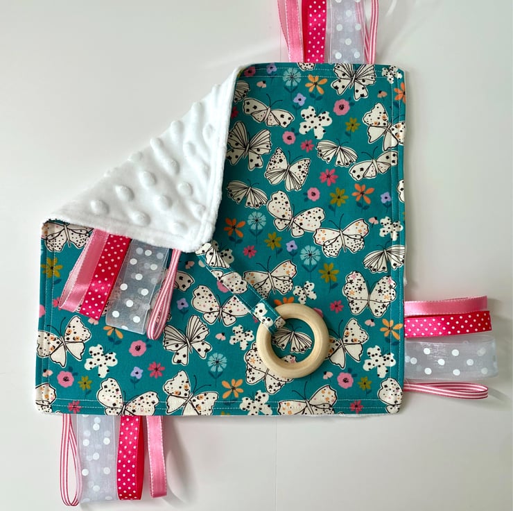 Front fabric is 100% cotton in a beautiful butterfly print and it’s backed with a beautiful soft white Minky fleece. I’ve used a natural wood teething ring and added lots of different ribbons for little ones to explore.