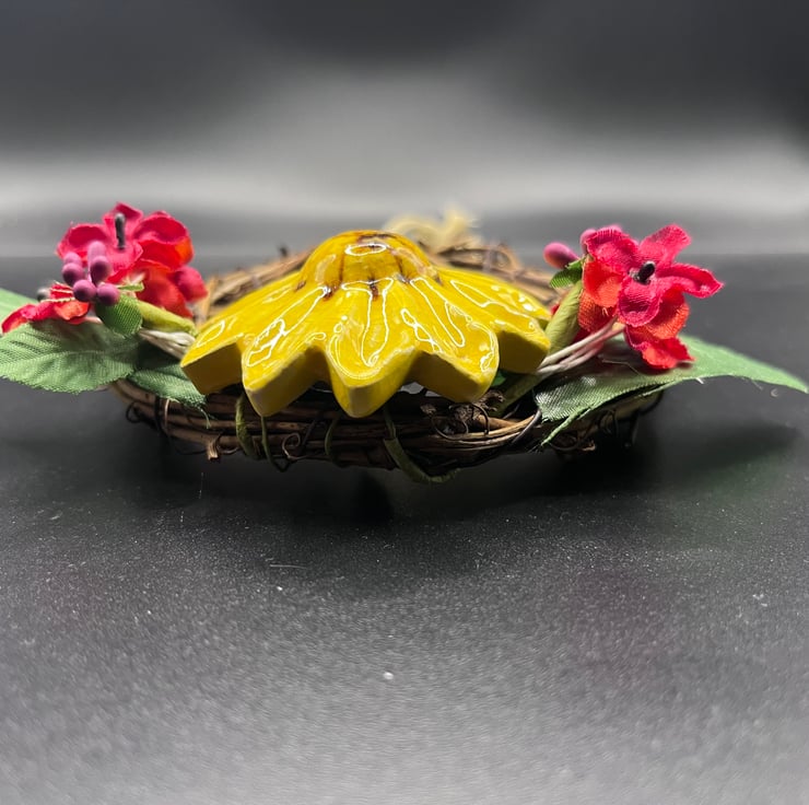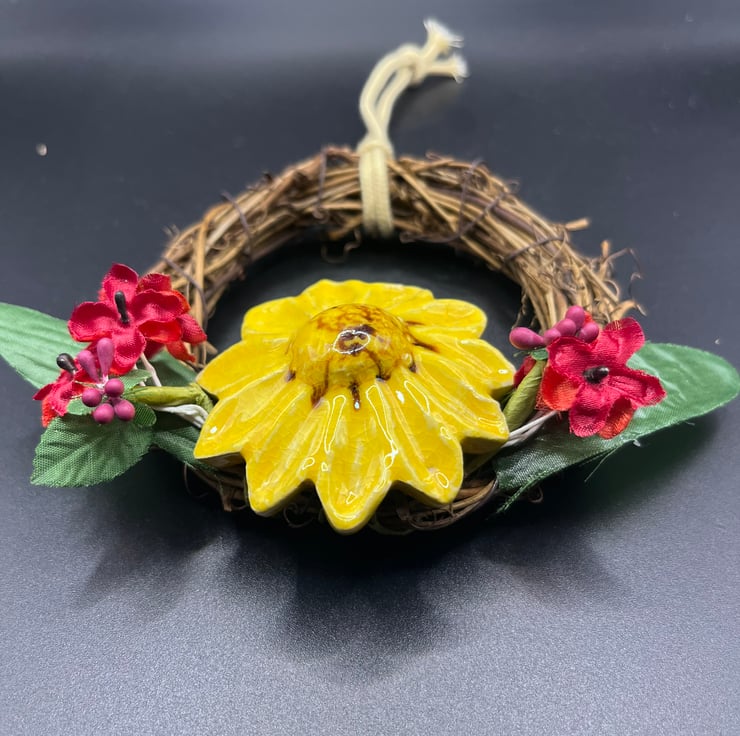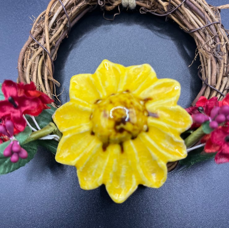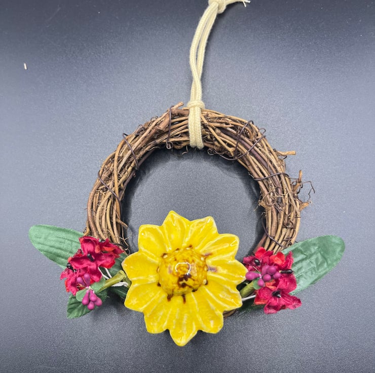 Wreath made from grape vine with a ceramic yellow flower…wreath is 100mm diameter…yellow ceramic flower is 60mm diameter…faux foliage with red cloth flowers….approximately 40mm thick…hold up by a piece of string 90mm long…thanks for looking…