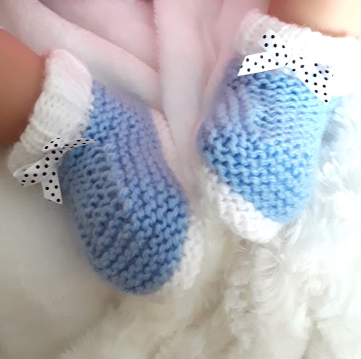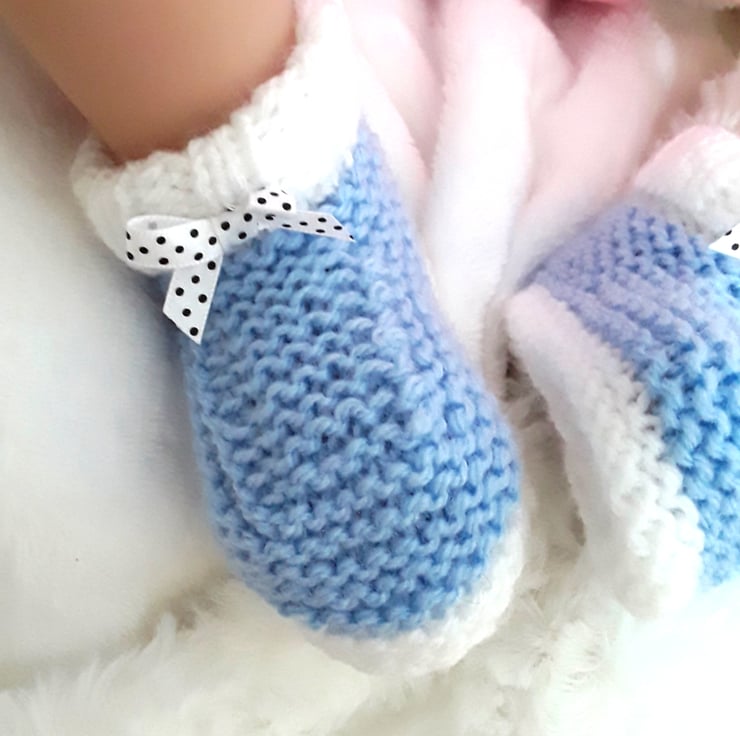 Hand knitted baby girl blue and white booties with folded over ribbed cuffs to keep little feet warm and polka dot bows ideal for a new baby gift