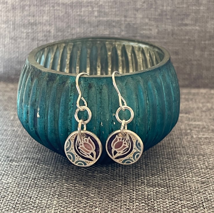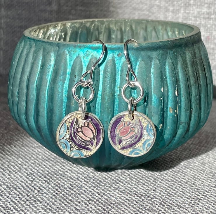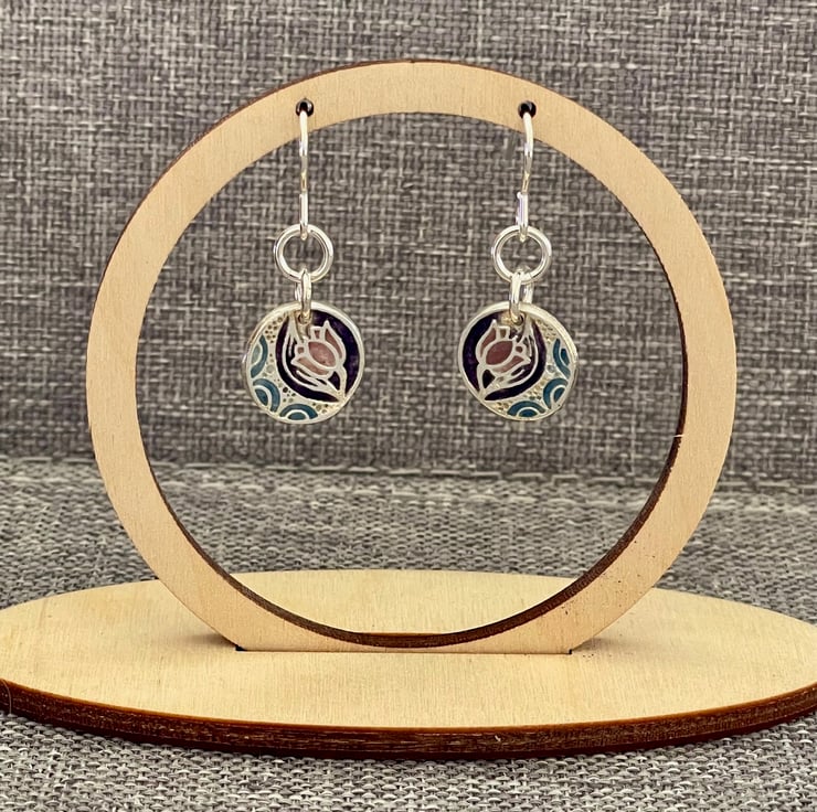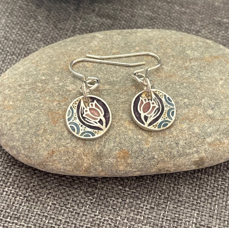My first pair of enamelled fine silver earrings. These incorporate a pretty dusky pink and purple flower with some blue detail. These drop earrings hang from sterling silver earring hooks.