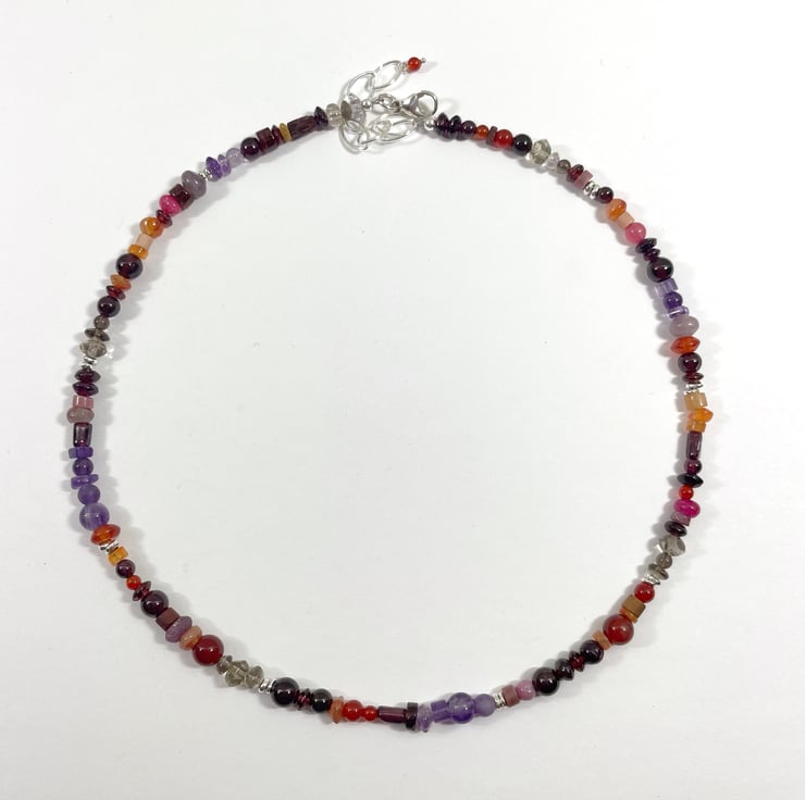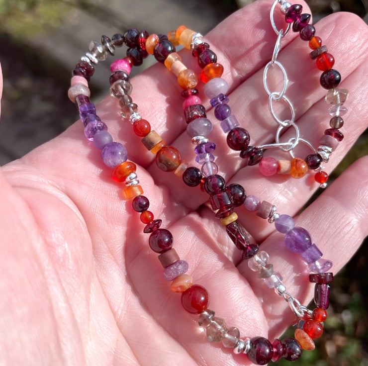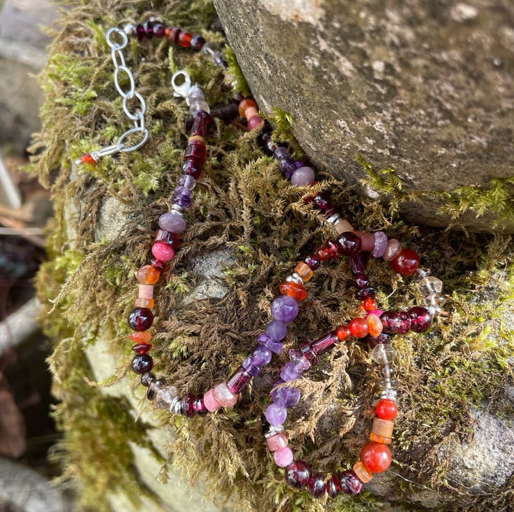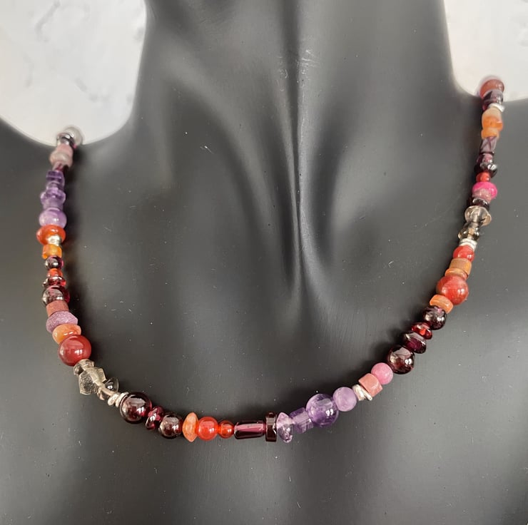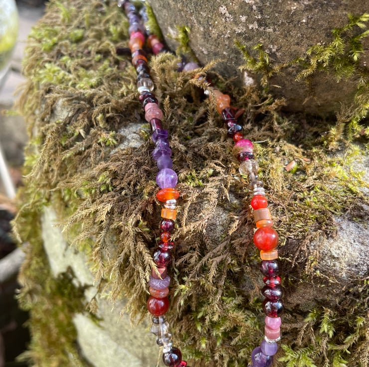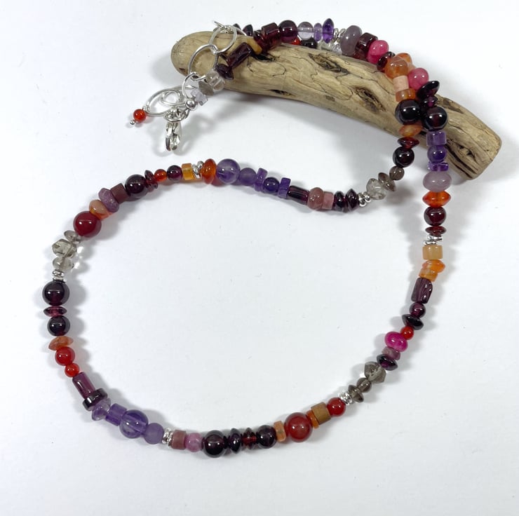 I have gathered stones in reds, oranges, purples and greys to make this necklace.