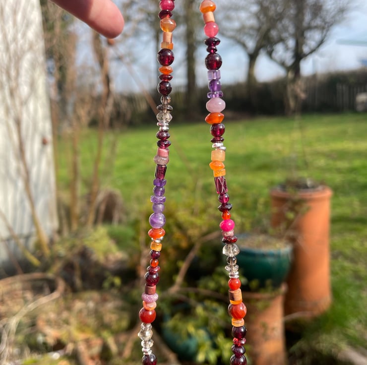 Garnet, carnelian, amethyst and smoky quartz are the predominant gemstones, but there are others too. Ruby, jasper, aventurine and agate have also slipped in. The beads are in a mix of profiles and finishes, the majority are around 4mm, the larger ones 6mm diameter.