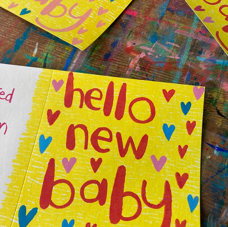i wanted to make a more hand painted version of my new baby card, with the opportunity to vary the colours more- not everyone wants pink or blue, and hand printing and painting means the possibilities are endless!