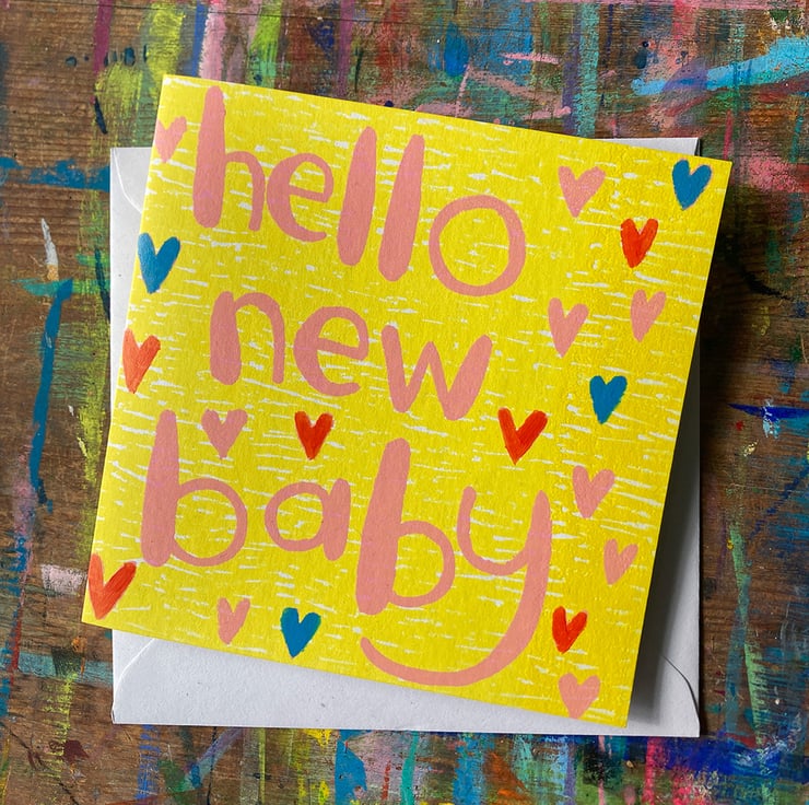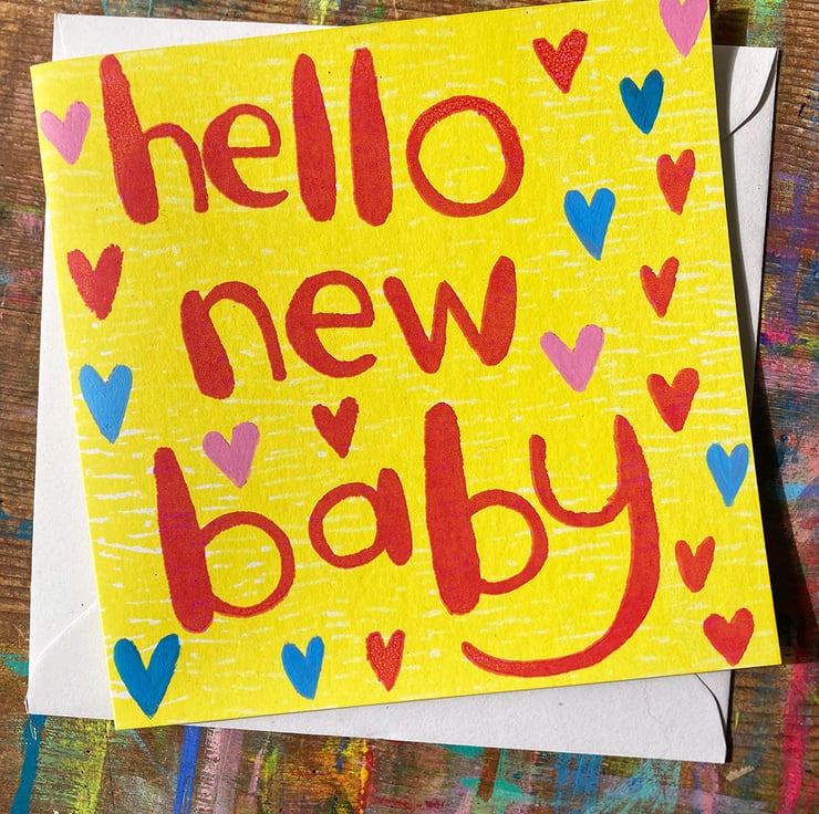 A new version of my Hello New Baby card, this time screen printed and embellished with hand painted hearts to make each one unique.