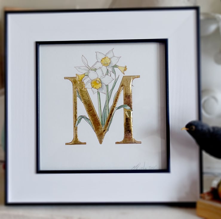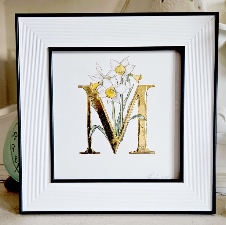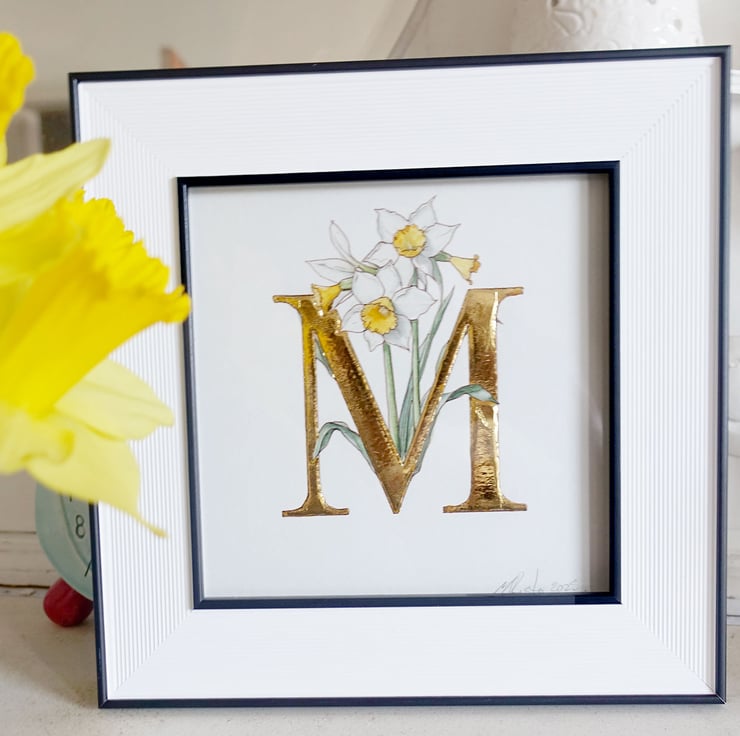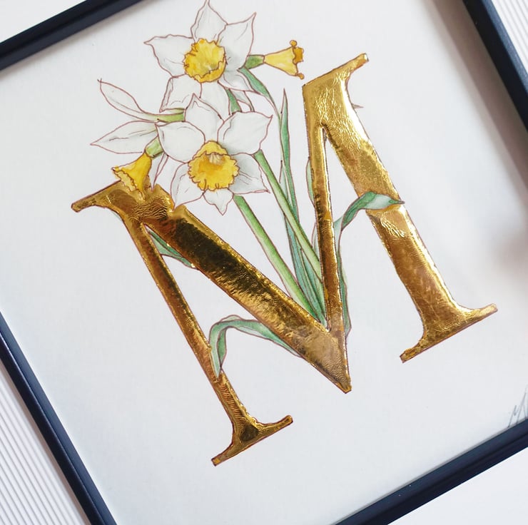 Watercolour narcissus entwined around a large letter M that is covered in 23.5 carat pure gold leaf.