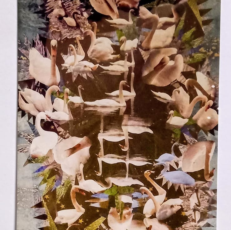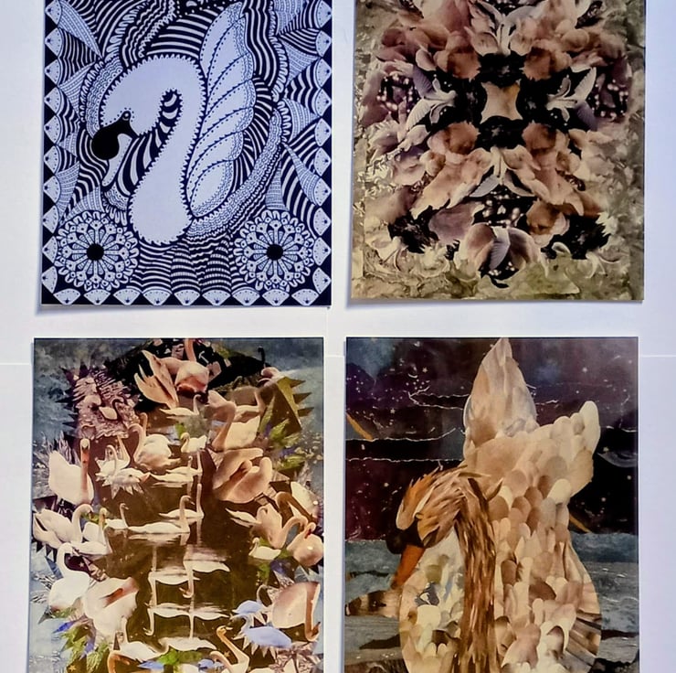 Set of 4 cards, A5 size, printed on quality gloss card. Prints show original hand cut collages made from personal photographs of a swan I cared for and one ink drawing.