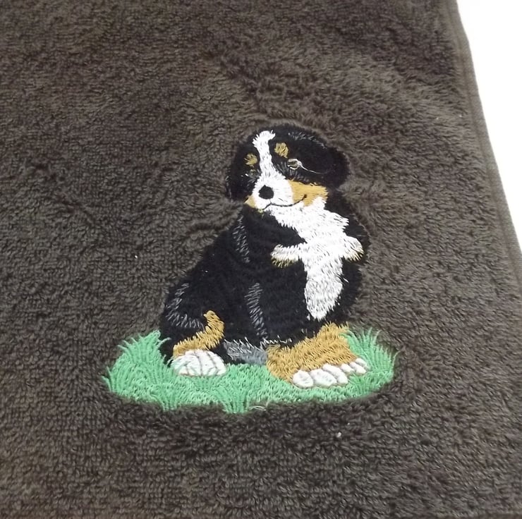 Machine Embroidered by me. Bernese Mountain Dog design machine embroidered Bath Towel. Chocolate Brown. Towel measures 70cm x 137cm. 100% Turkish Cotton. t8